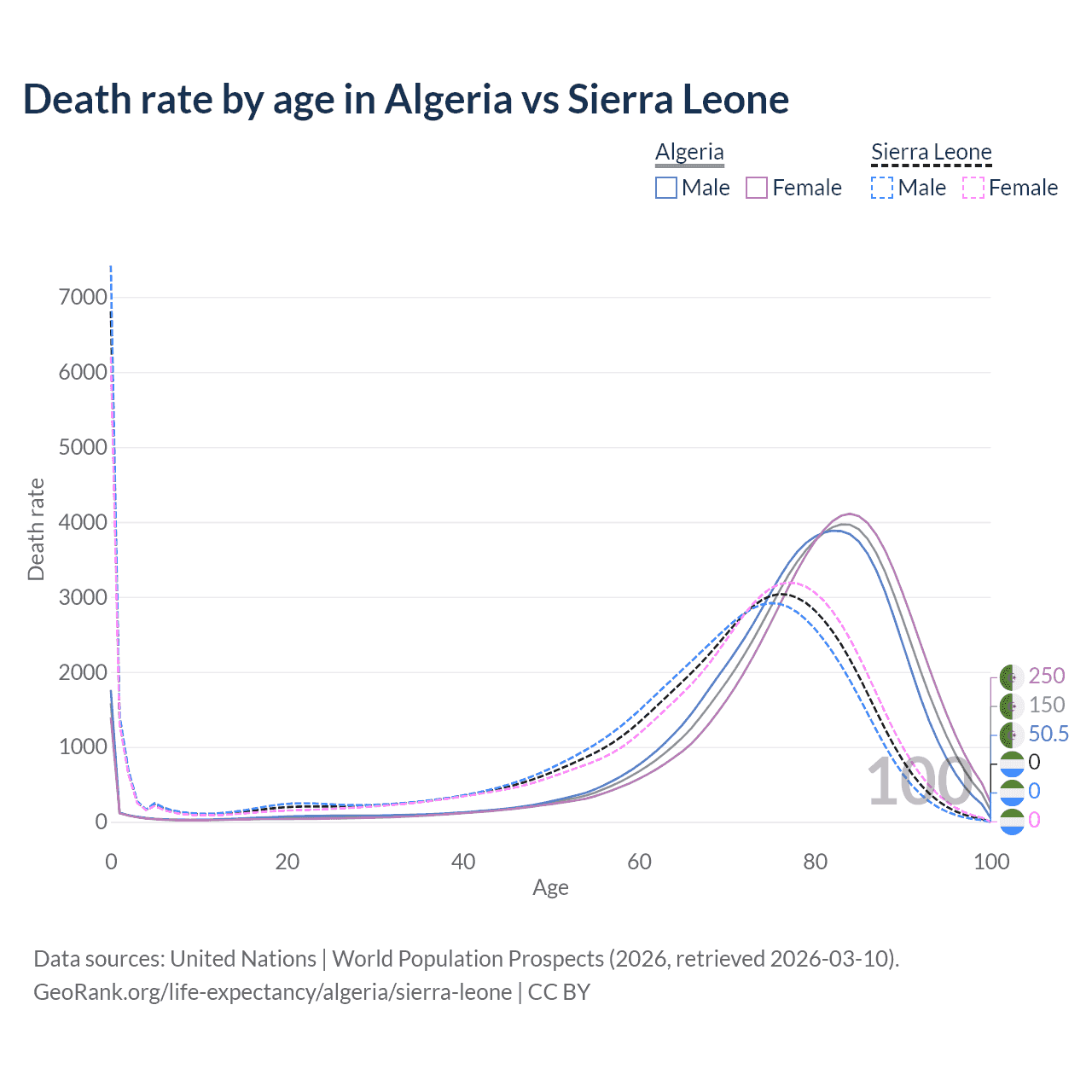 In Algeria, the most common age of death is 83, compared to 0 in Sierra Leone. The median age of death is 80.4 in Algeria and 70.8 in Sierra Leone, meaning only half of each cohort is expected to live past that age.