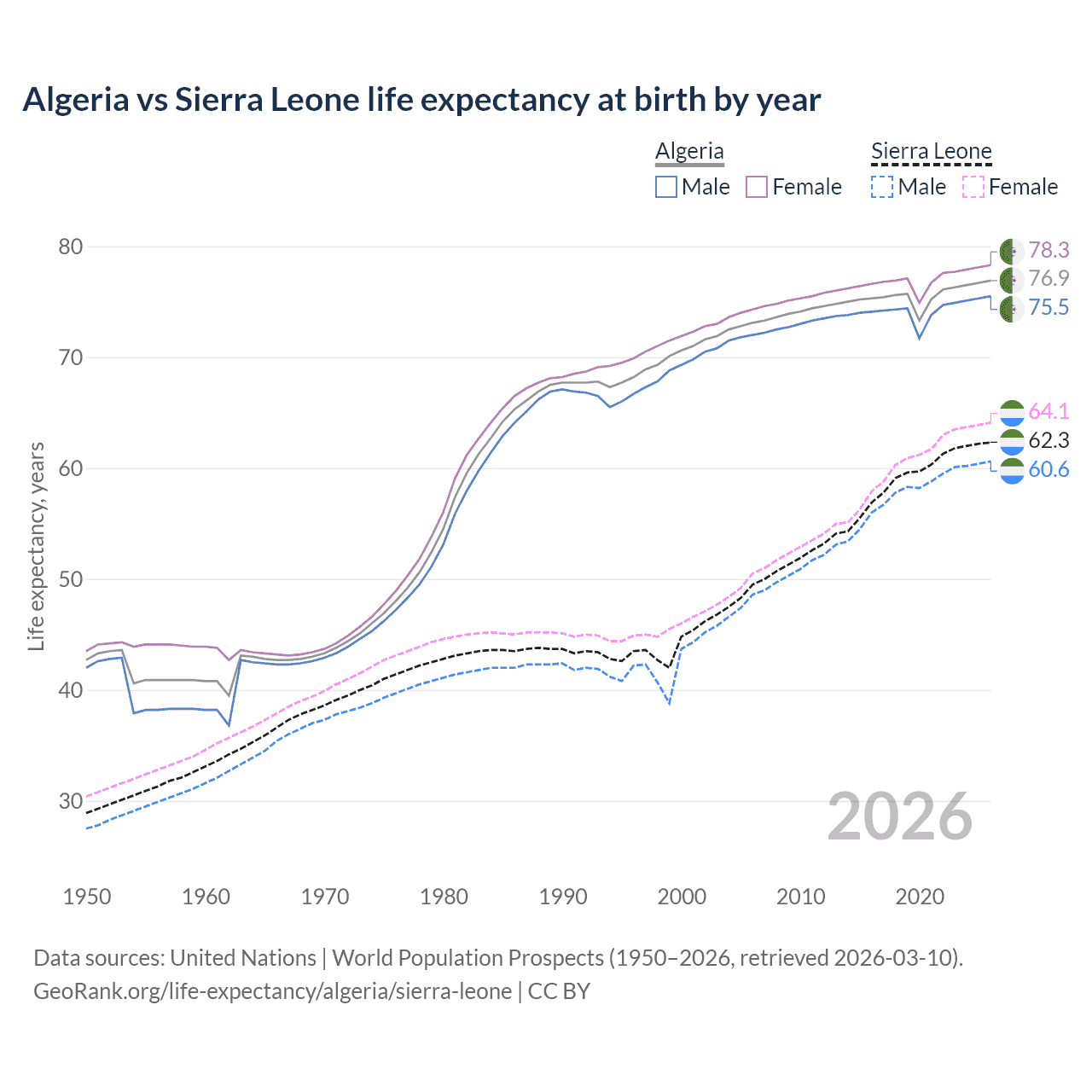 The average life expectancy at birth is 76.9 years in Algeria vs 62.3 in Sierra Leone. Algeria is ranked 76/197 by life expectancy, and Sierra Leone is 186/197. In Algeria, the life expectancy is 75.5 years for males and 78.3 years for females. In Sierra Leone, it's 60.6 years for males and 64.1 years for females.