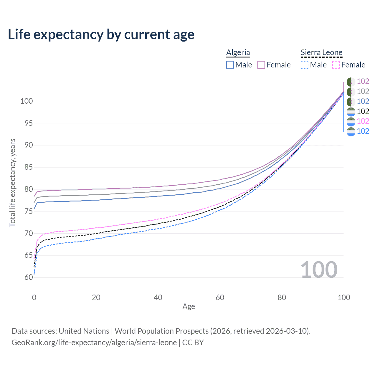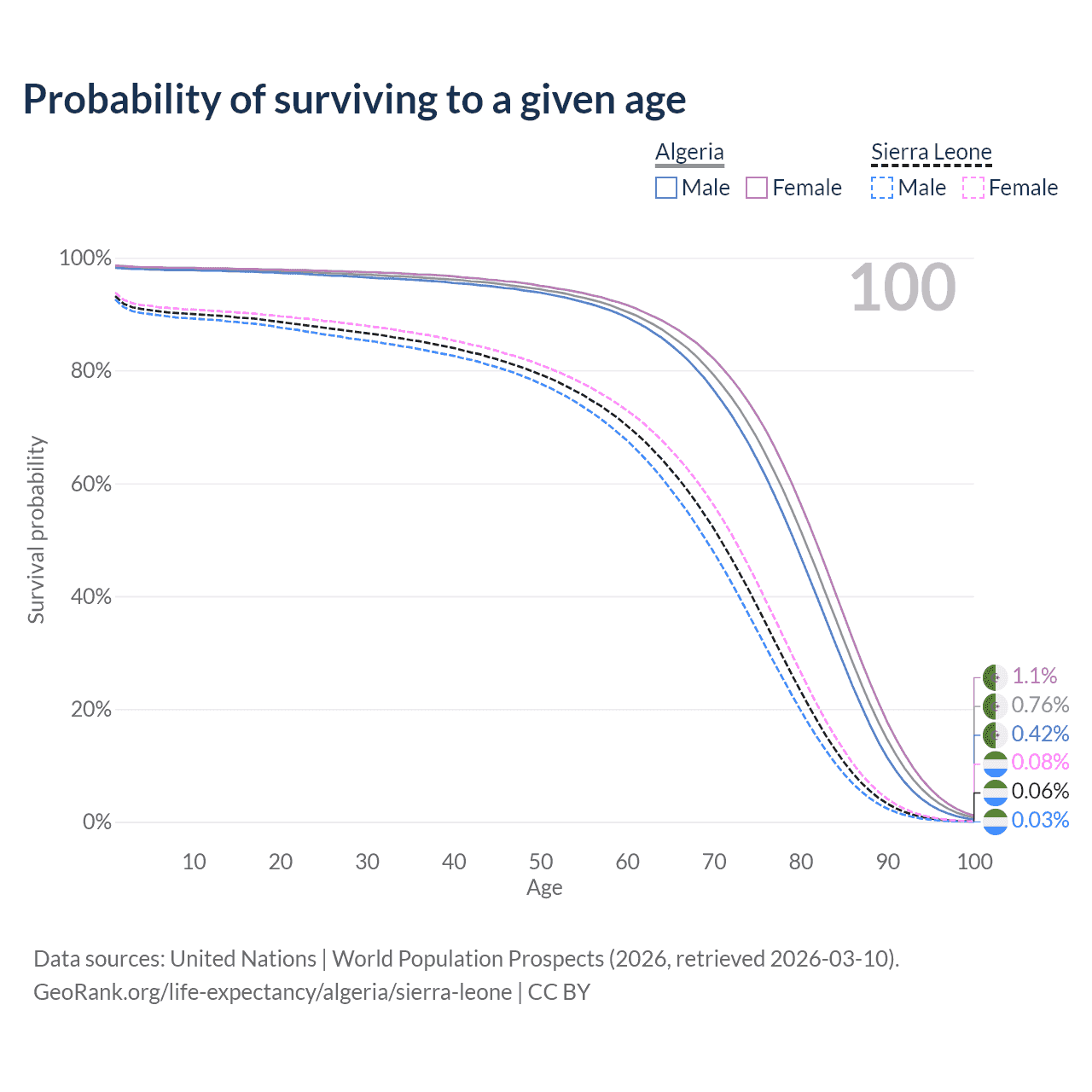 This life expectancy calculator shows the odds of living to 100, 95, 90, and below based on current age for both males and females in Algeria and Sierra Leone, along with mean and median age of death. The calculations are based on the 2026 life tables (actuarial tables) from the UN World Population Prospects.