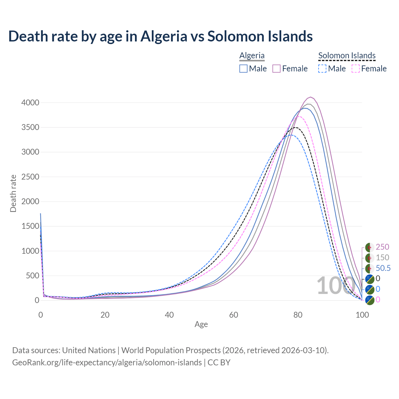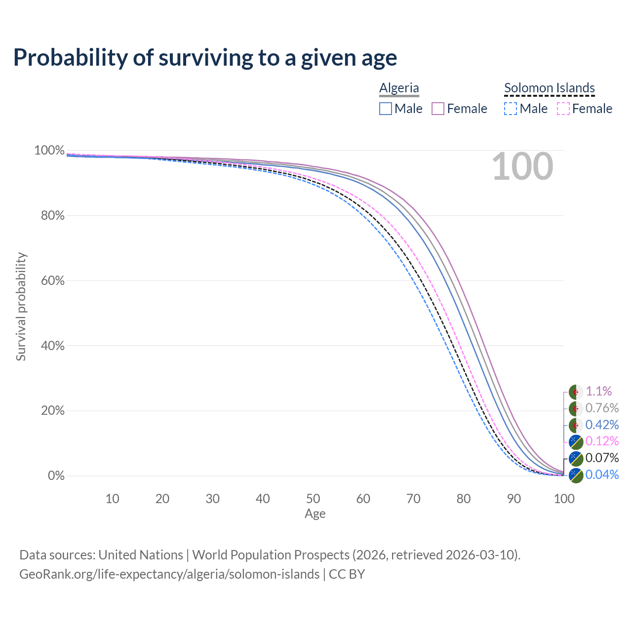 This life expectancy calculator shows the odds of living to 100, 95, 90, and below based on current age for both males and females in Algeria and the Solomon Islands, along with mean and median age of death. The calculations are based on the 2026 life tables (actuarial tables) from the UN World Population Prospects.