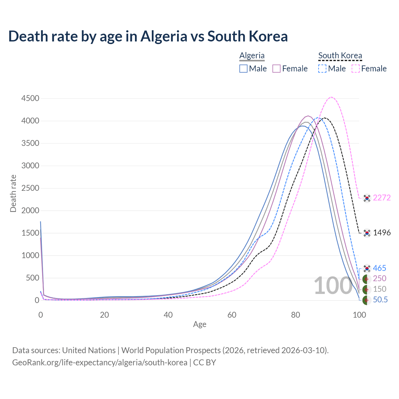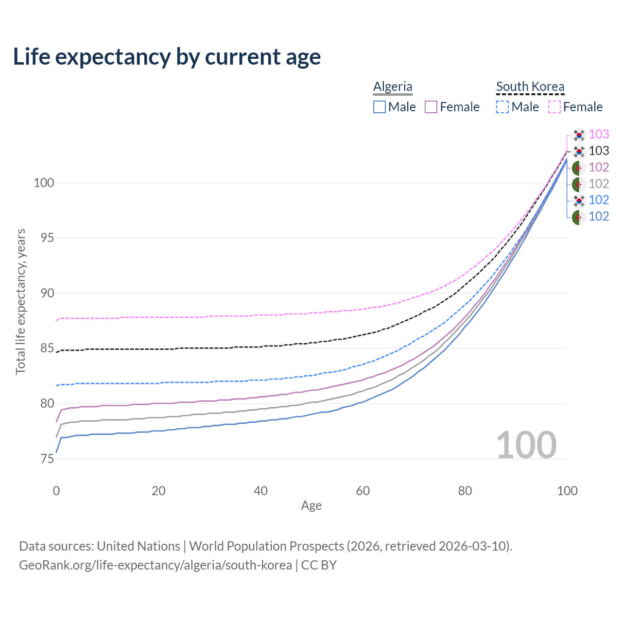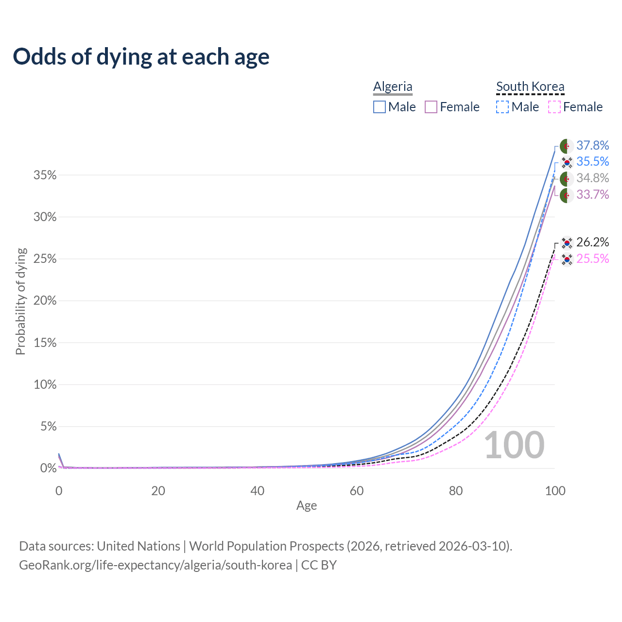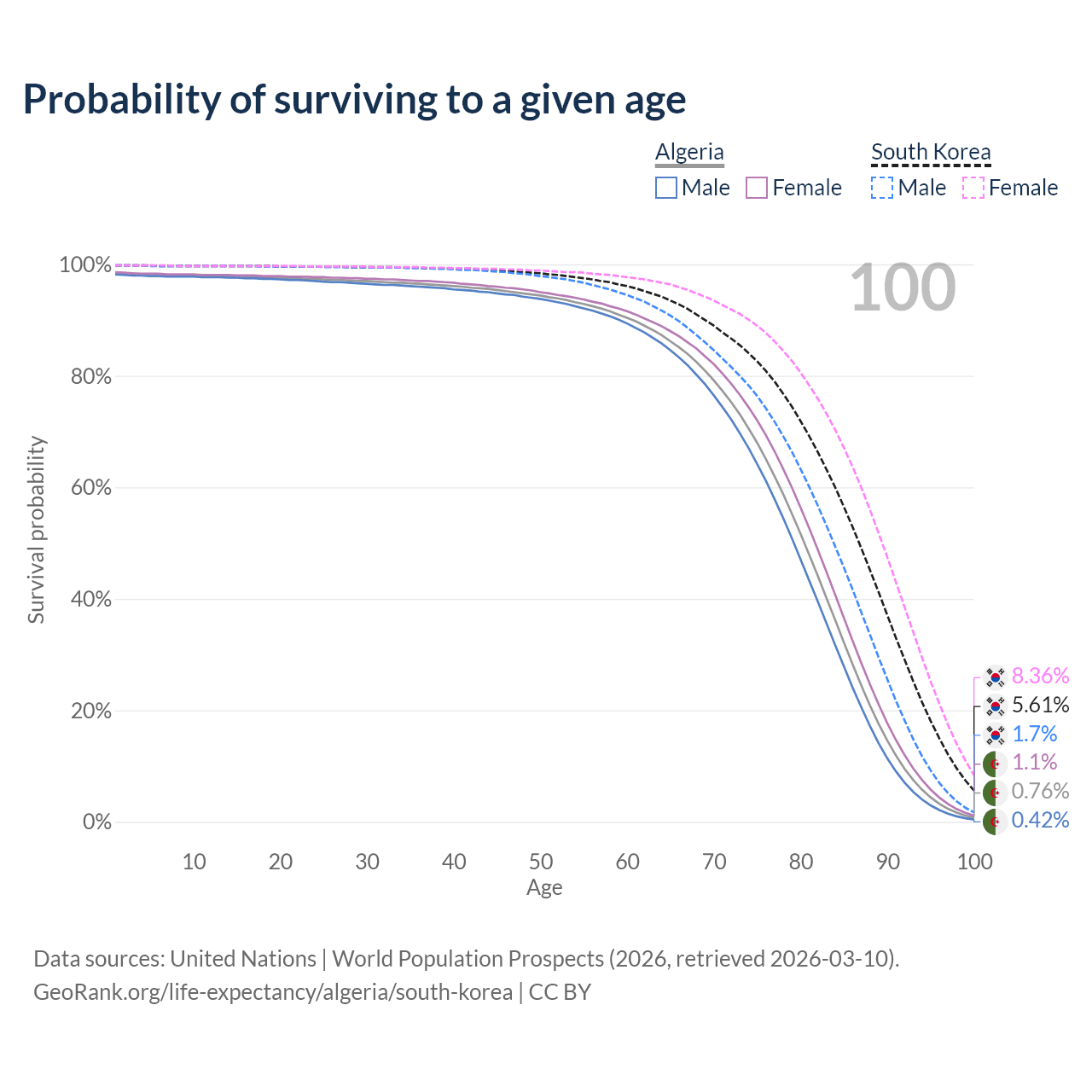 This life expectancy calculator shows the odds of living to 100, 95, 90, and below based on current age for both males and females in Algeria and South Korea, along with mean and median age of death. The calculations are based on the 2026 life tables (actuarial tables) from the UN World Population Prospects.