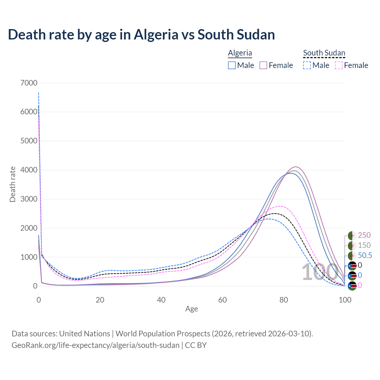 In Algeria, the most common age of death is 83, compared to 0 in South Sudan. The median age of death is 80.4 in Algeria and 67.5 in South Sudan, meaning only half of each cohort is expected to live past that age.