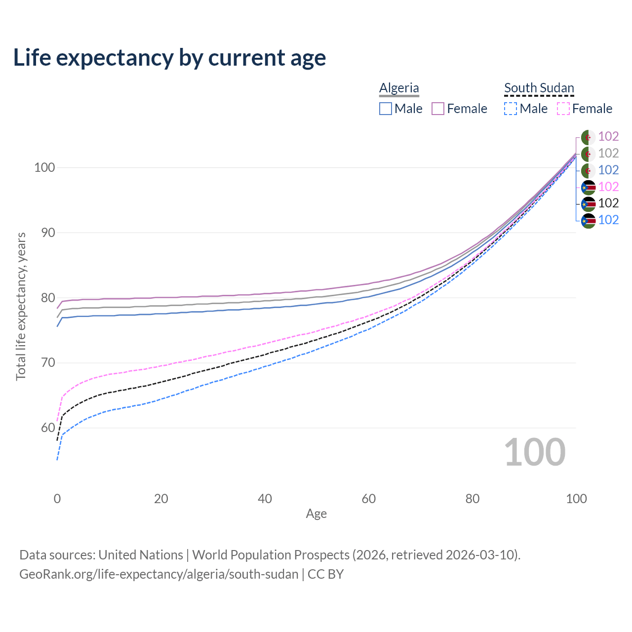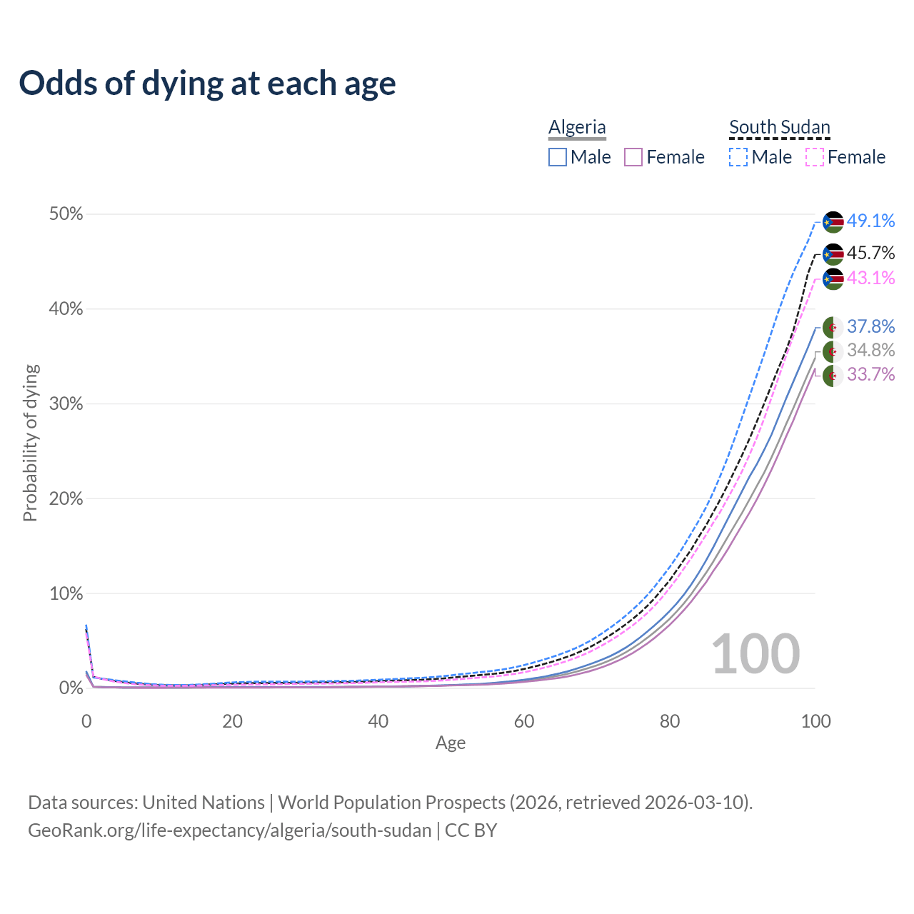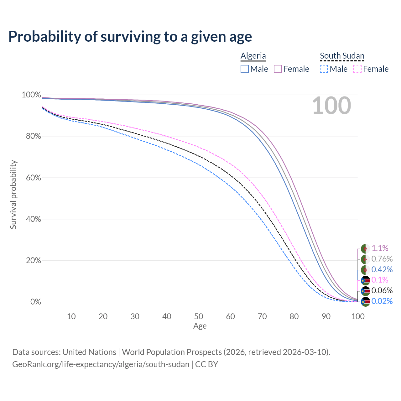 This life expectancy calculator shows the odds of living to 100, 95, 90, and below based on current age for both males and females in Algeria and South Sudan, along with mean and median age of death. The calculations are based on the 2026 life tables (actuarial tables) from the UN World Population Prospects.