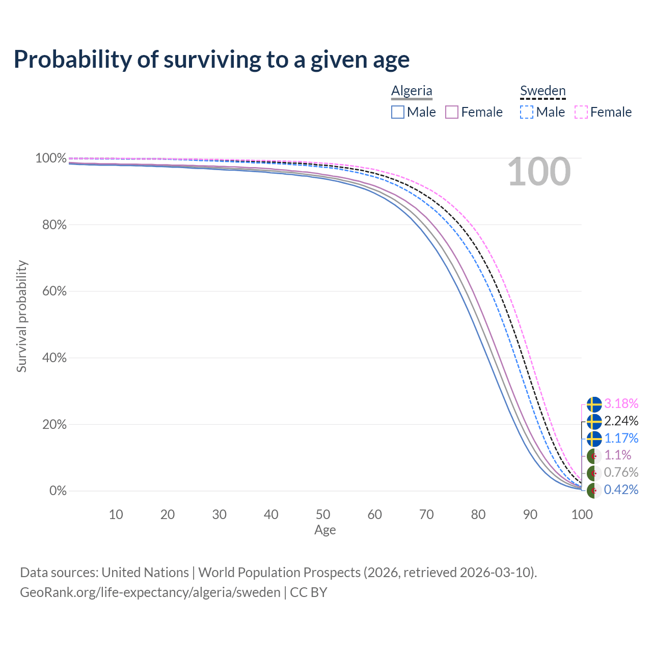 This life expectancy calculator shows the odds of living to 100, 95, 90, and below based on current age for both males and females in Algeria and Sweden, along with mean and median age of death. The calculations are based on the 2026 life tables (actuarial tables) from the UN World Population Prospects.