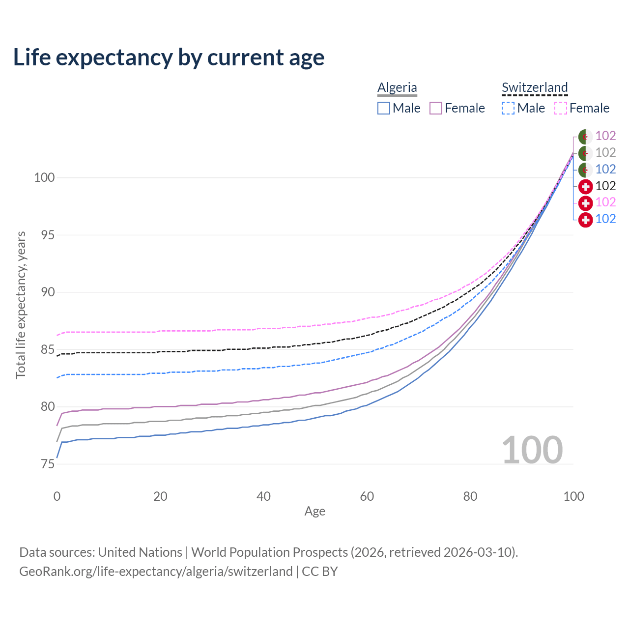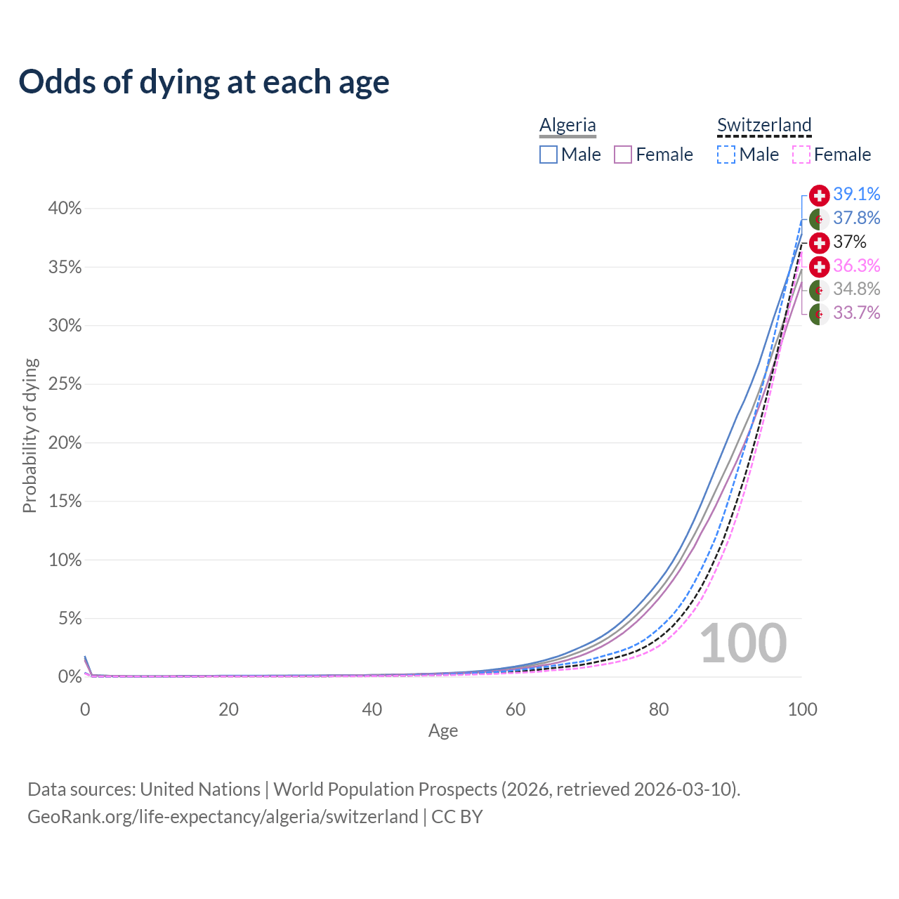 This life expectancy calculator shows the odds of living to 100, 95, 90, and below based on current age for both males and females in Algeria and Switzerland, along with mean and median age of death. The calculations are based on the 2026 life tables (actuarial tables) from the UN World Population Prospects.