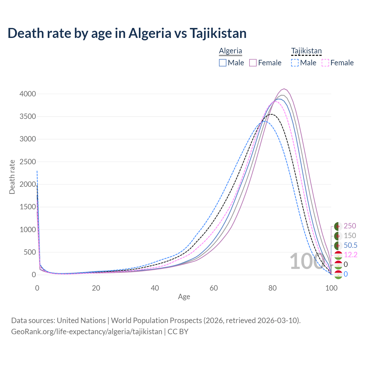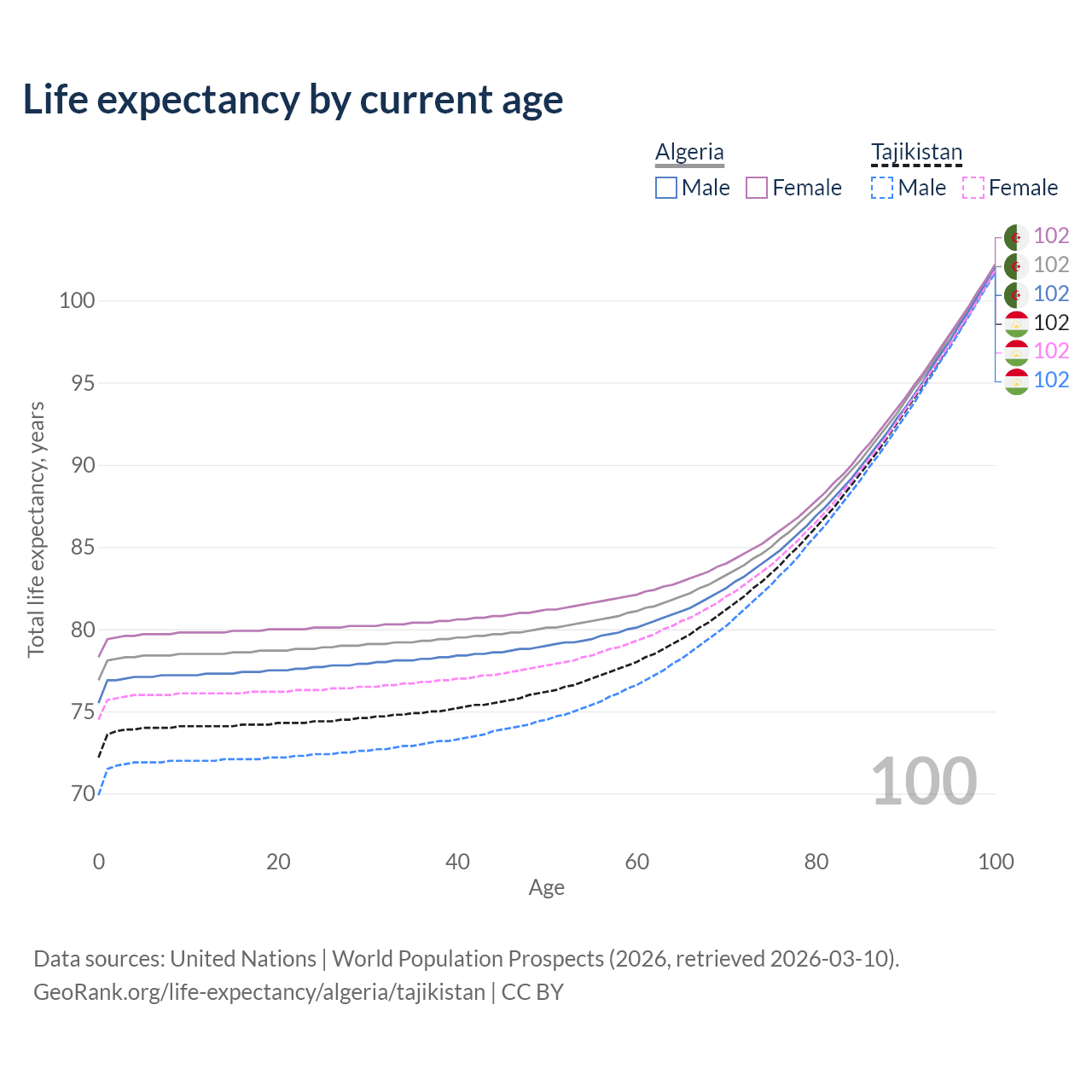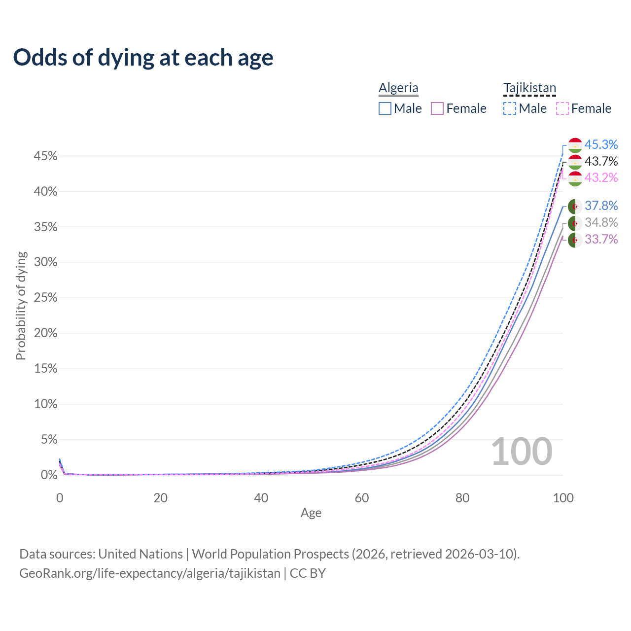 This life expectancy calculator shows the odds of living to 100, 95, 90, and below based on current age for both males and females in Algeria and Tajikistan, along with mean and median age of death. The calculations are based on the 2026 life tables (actuarial tables) from the UN World Population Prospects.