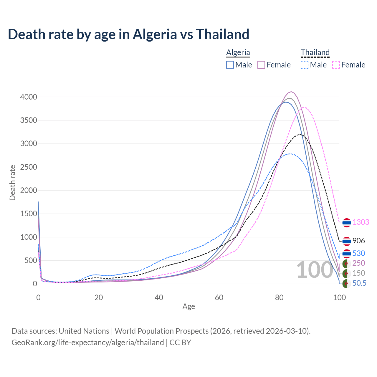 In Algeria, the most common age of death is 83, compared to 87 in Thailand. The median age of death is 80.4 in Algeria and 81.8 in Thailand, meaning only half of each cohort is expected to live past that age.