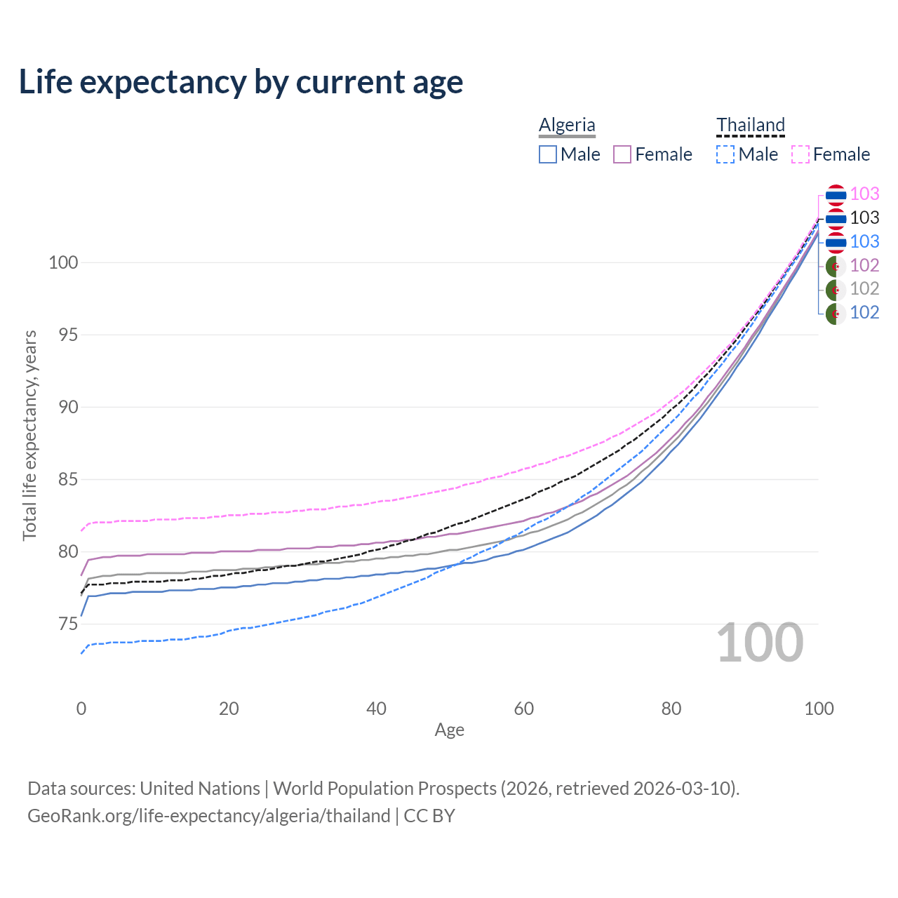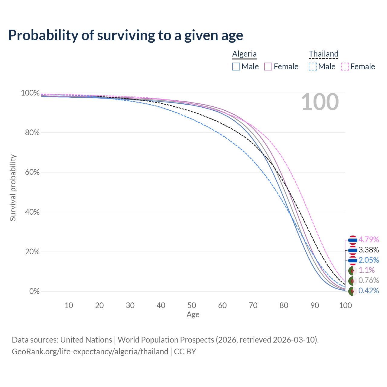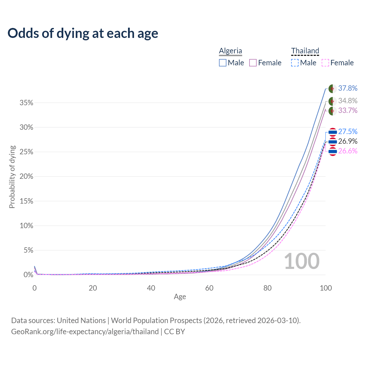 This life expectancy calculator shows the odds of living to 100, 95, 90, and below based on current age for both males and females in Algeria and Thailand, along with mean and median age of death. The calculations are based on the 2026 life tables (actuarial tables) from the UN World Population Prospects.