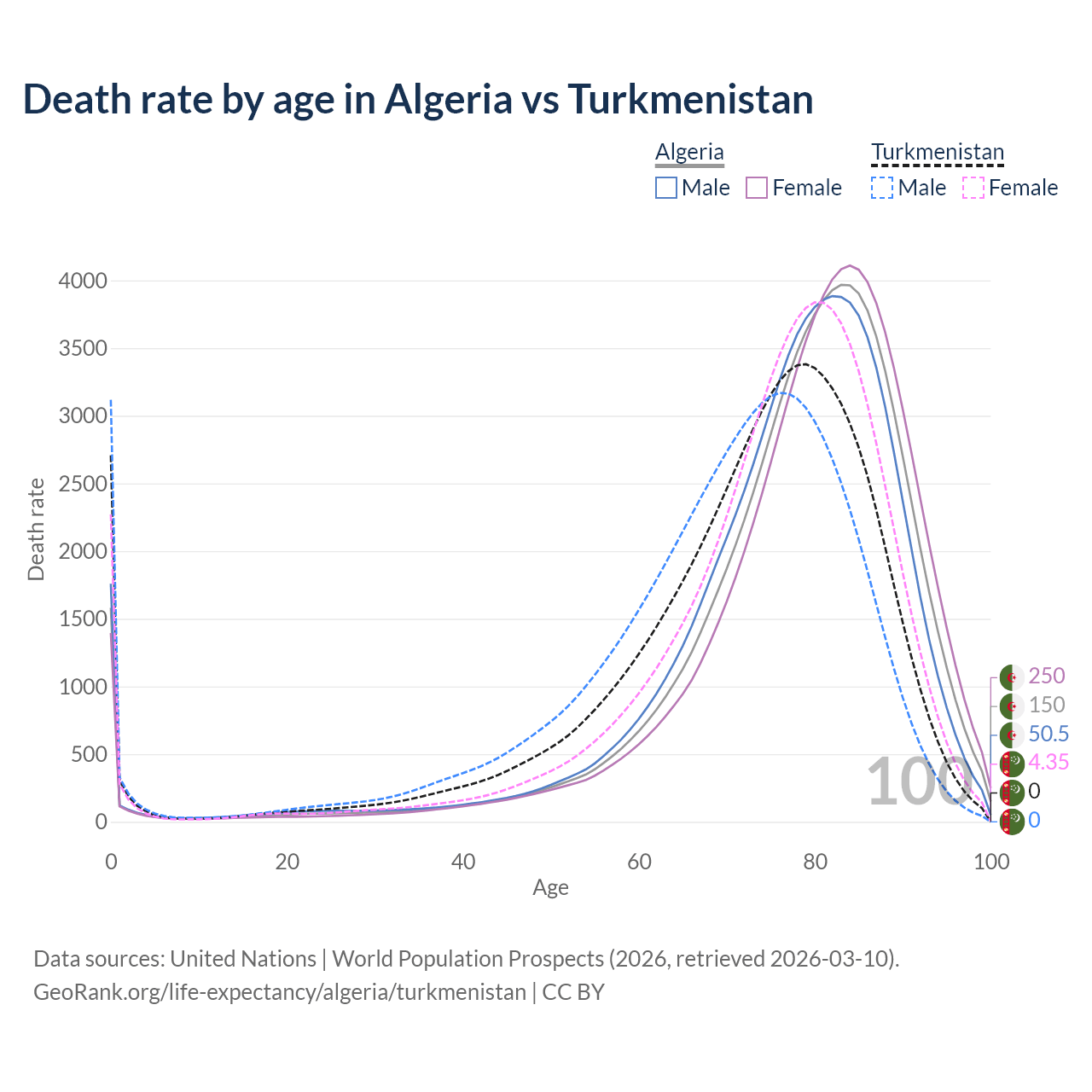 This life expectancy calculator shows the odds of living to 100, 95, 90, and below based on current age for both males and females in Algeria and Turkmenistan, along with mean and median age of death. The calculations are based on the 2026 life tables (actuarial tables) from the UN World Population Prospects.