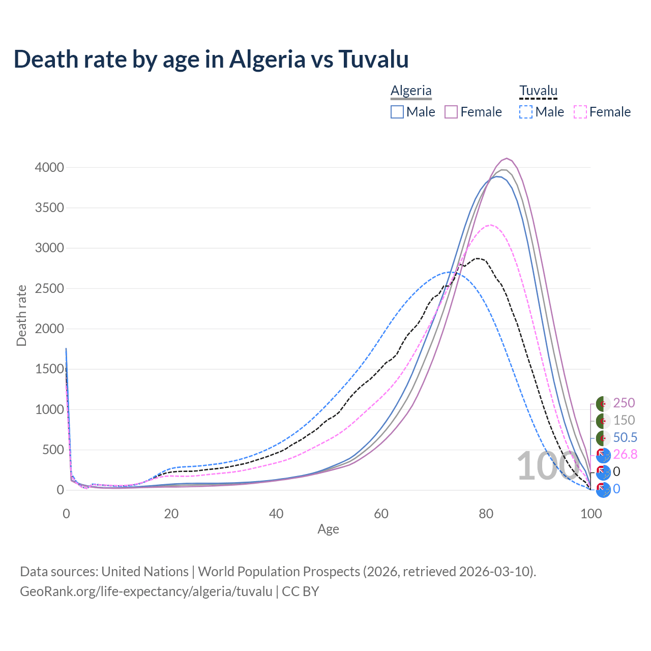 In Algeria, the most common age of death is 83, compared to 78 in Tuvalu. The median age of death is 80.4 in Algeria and 71.9 in Tuvalu, meaning only half of each cohort is expected to live past that age.