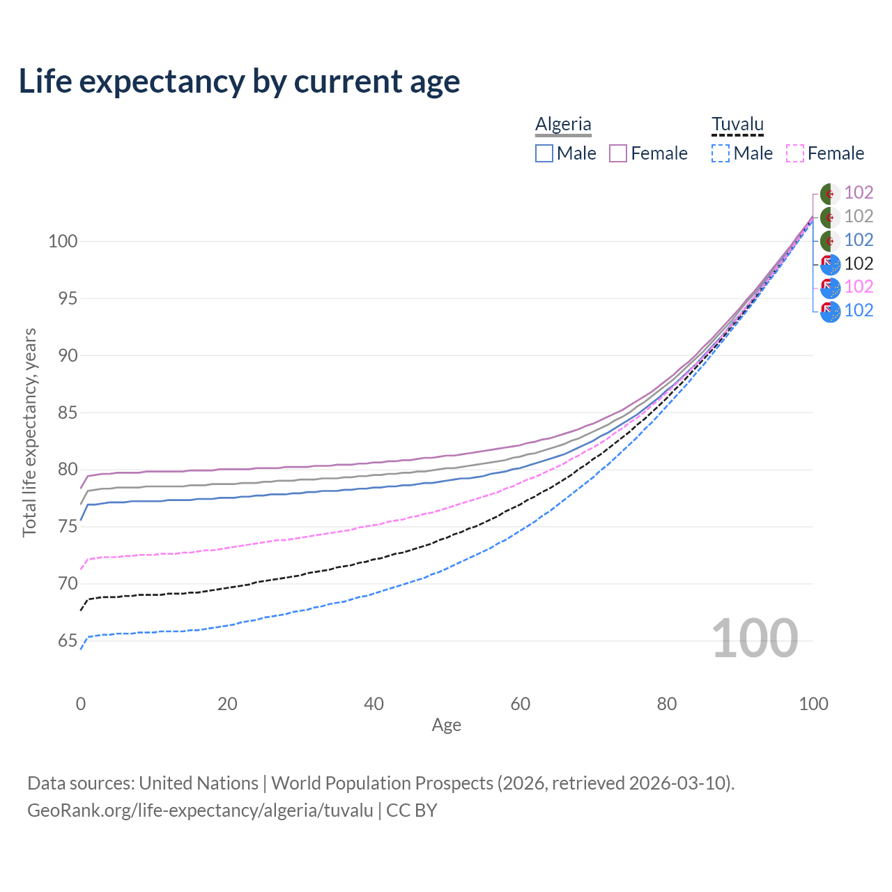 This life expectancy calculator shows the odds of living to 100, 95, 90, and below based on current age for both males and females in Algeria and Tuvalu, along with mean and median age of death. The calculations are based on the 2026 life tables (actuarial tables) from the UN World Population Prospects.