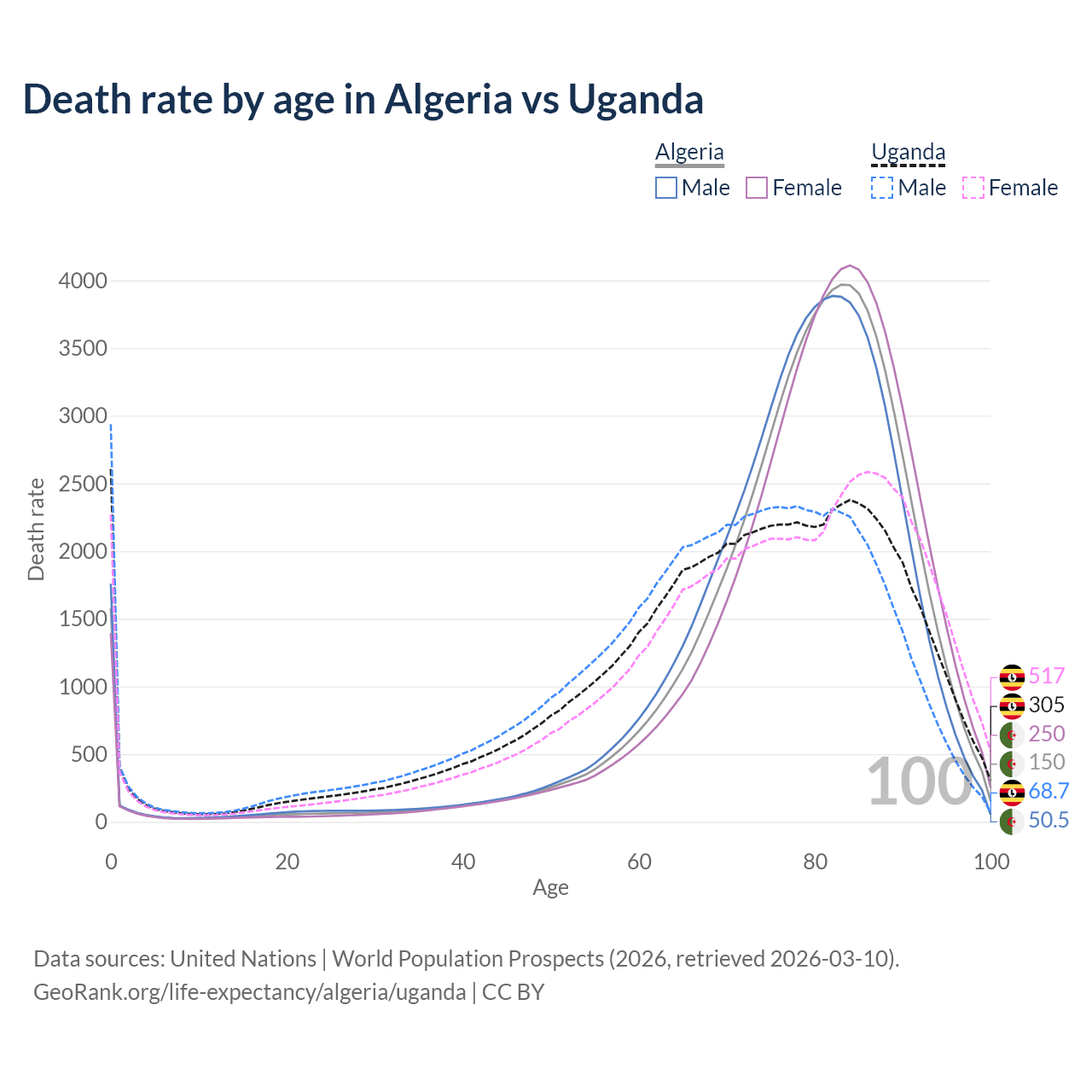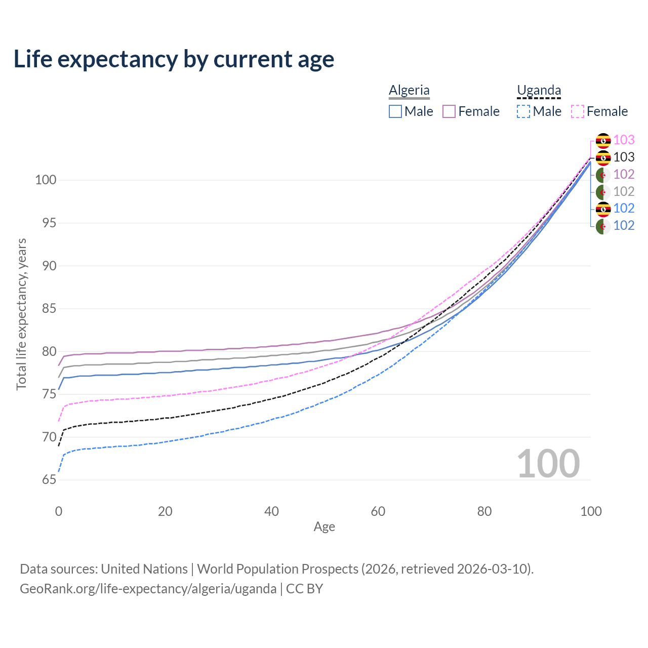 This life expectancy calculator shows the odds of living to 100, 95, 90, and below based on current age for both males and females in Algeria and Uganda, along with mean and median age of death. The calculations are based on the 2026 life tables (actuarial tables) from the UN World Population Prospects.