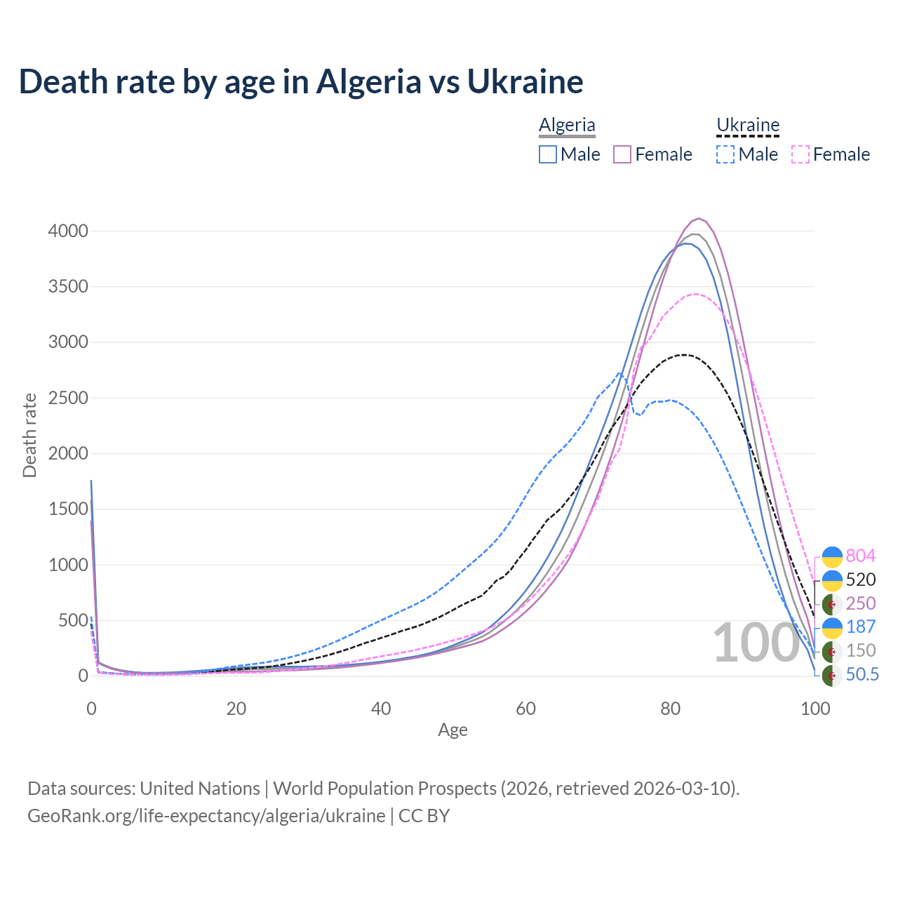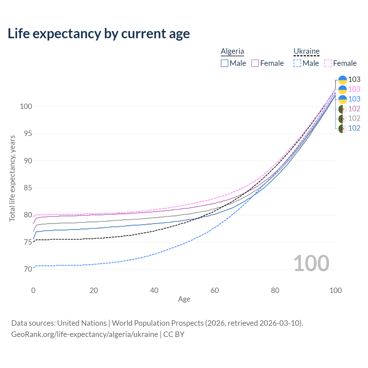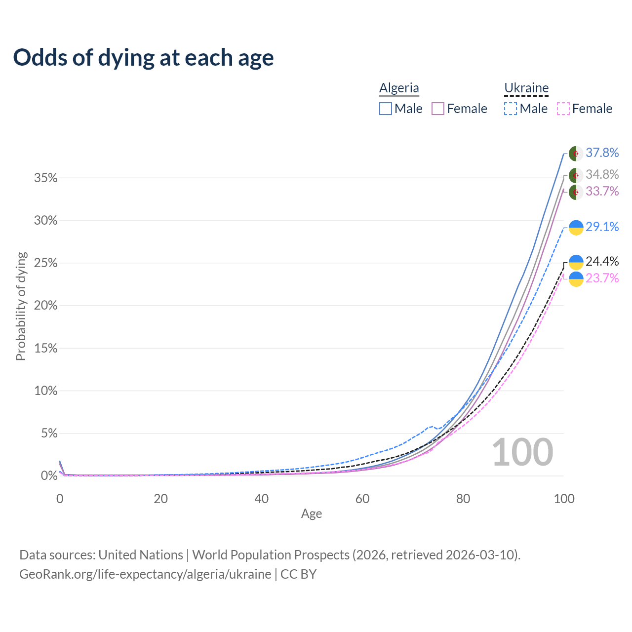 This life expectancy calculator shows the odds of living to 100, 95, 90, and below based on current age for both males and females in Algeria and Ukraine, along with mean and median age of death. The calculations are based on the 2026 life tables (actuarial tables) from the UN World Population Prospects.
