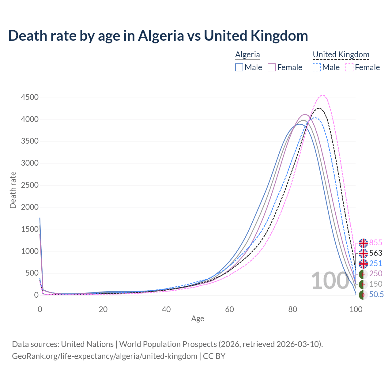 In Algeria, the most common age of death is 83, compared to 88 in the United Kingdom. The median age of death is 80.4 in Algeria and 84.9 in the United Kingdom, meaning only half of each cohort is expected to live past that age.