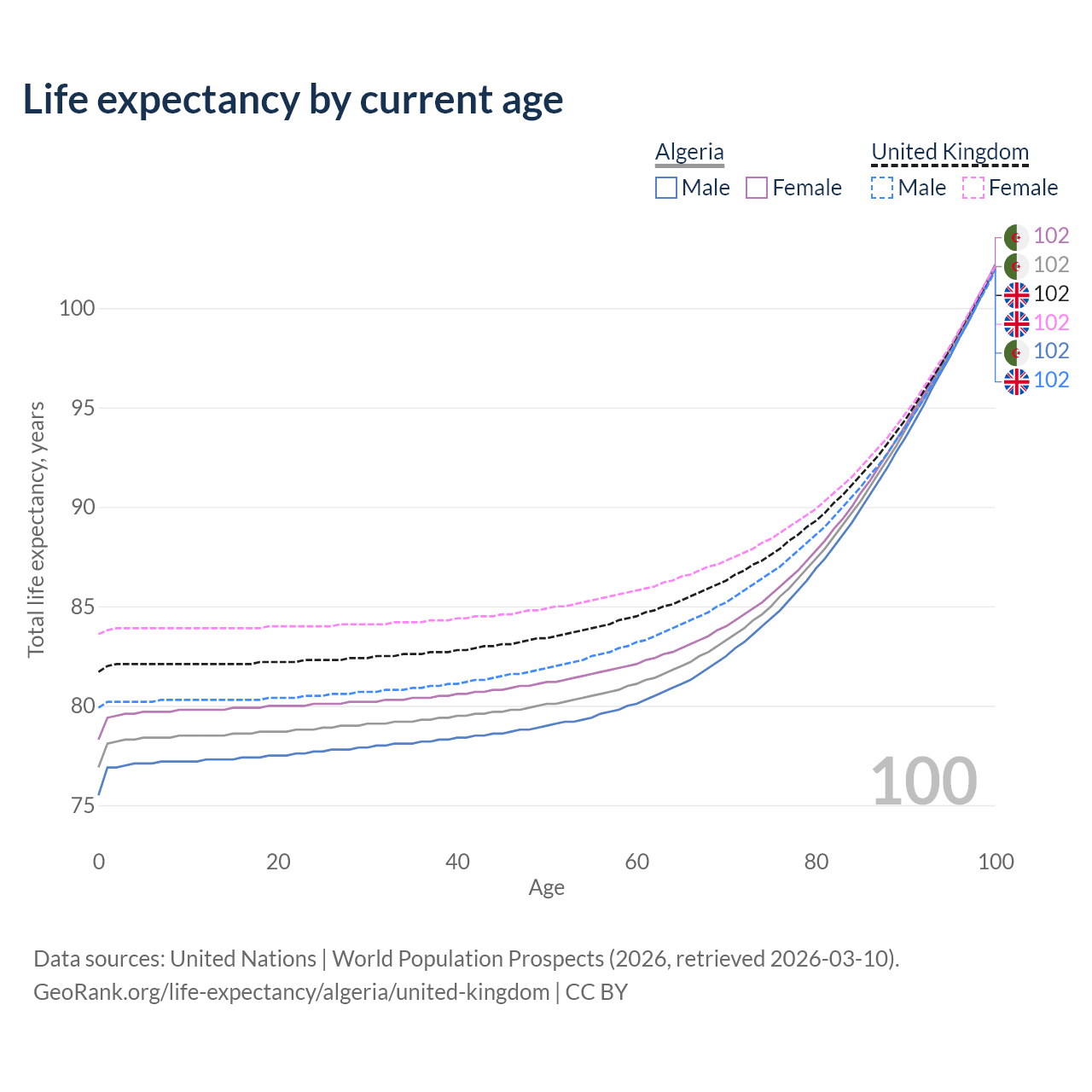 This life expectancy calculator shows the odds of living to 100, 95, 90, and below based on current age for both males and females in Algeria and the United Kingdom, along with mean and median age of death. The calculations are based on the 2026 life tables (actuarial tables) from the UN World Population Prospects.