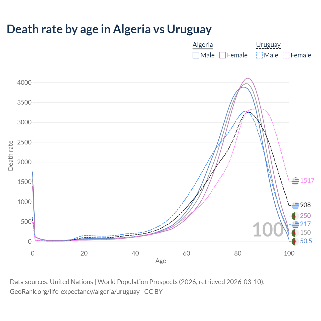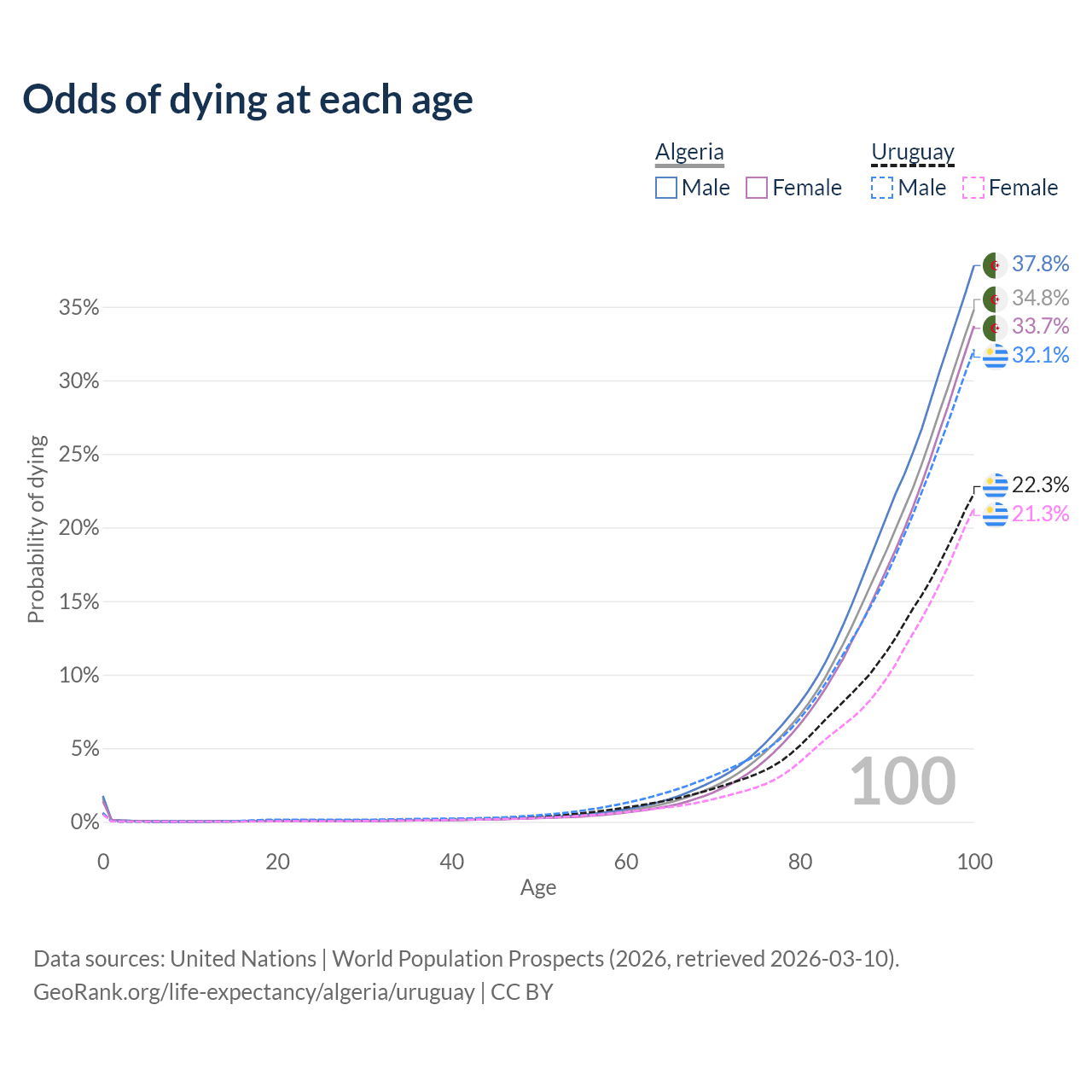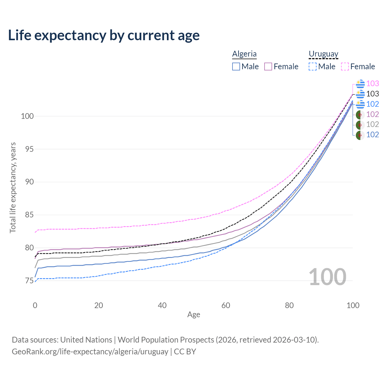 This life expectancy calculator shows the odds of living to 100, 95, 90, and below based on current age for both males and females in Algeria and Uruguay, along with mean and median age of death. The calculations are based on the 2026 life tables (actuarial tables) from the UN World Population Prospects.
