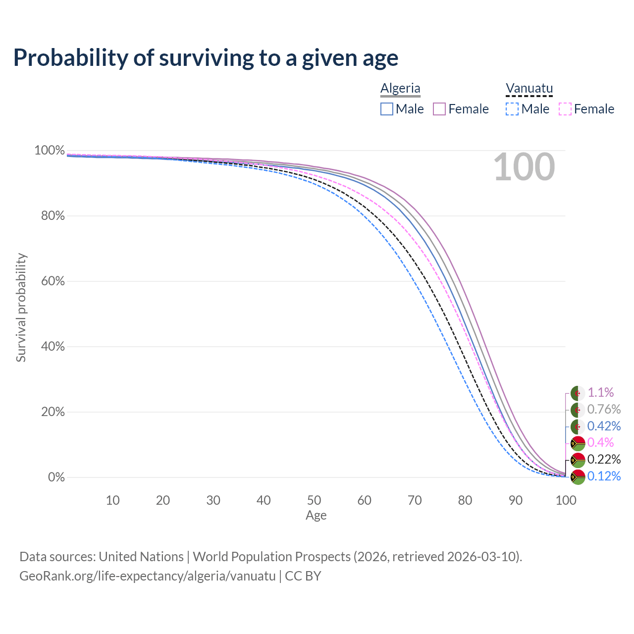 This life expectancy calculator shows the odds of living to 100, 95, 90, and below based on current age for both males and females in Algeria and Vanuatu, along with mean and median age of death. The calculations are based on the 2026 life tables (actuarial tables) from the UN World Population Prospects.