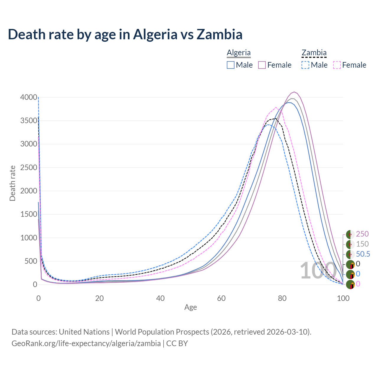 In Algeria, the most common age of death is 83, compared to 0 in Zambia. The median age of death is 80.4 in Algeria and 73.1 in Zambia, meaning only half of each cohort is expected to live past that age.