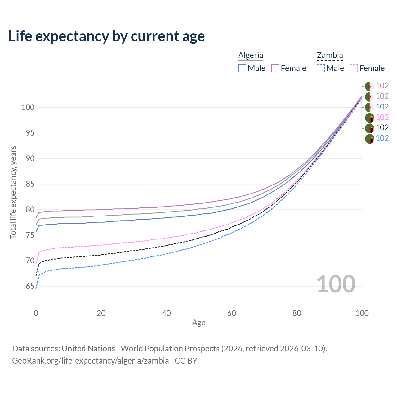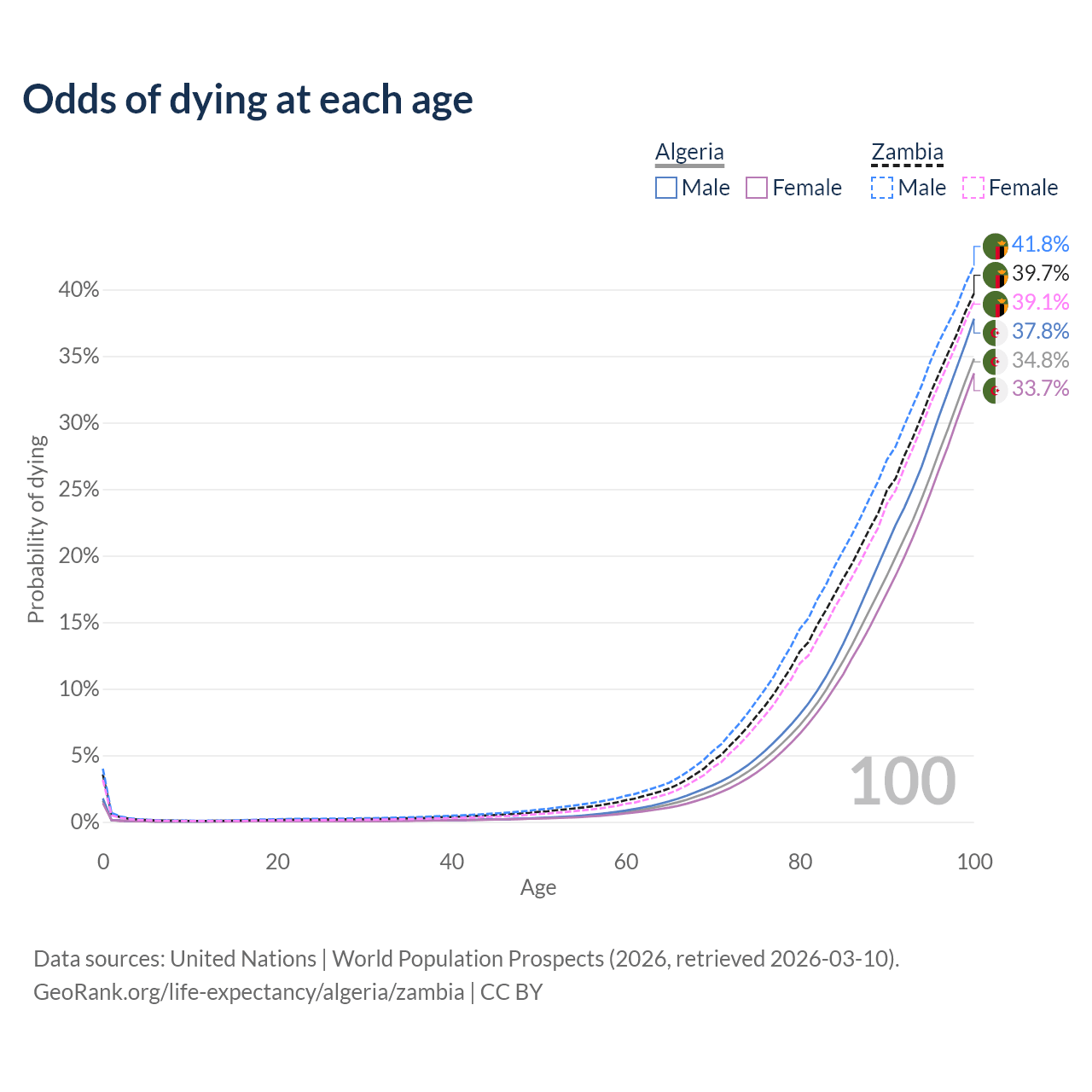 This life expectancy calculator shows the odds of living to 100, 95, 90, and below based on current age for both males and females in Algeria and Zambia, along with mean and median age of death. The calculations are based on the 2026 life tables (actuarial tables) from the UN World Population Prospects.