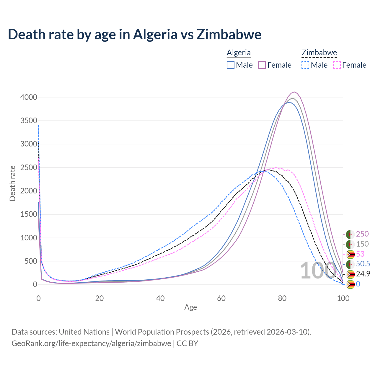 In Algeria, the most common age of death is 83, compared to 0 in Zimbabwe. The median age of death is 80.4 in Algeria and 68.8 in Zimbabwe, meaning only half of each cohort is expected to live past that age.