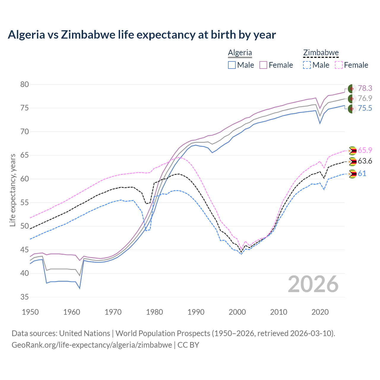The average life expectancy at birth is 76.9 years in Algeria vs 63.6 in Zimbabwe. Algeria is ranked 76/197 by life expectancy, and Zimbabwe is 180/197. In Algeria, the life expectancy is 75.5 years for males and 78.3 years for females. In Zimbabwe, it's 61 years for males and 65.9 years for females.