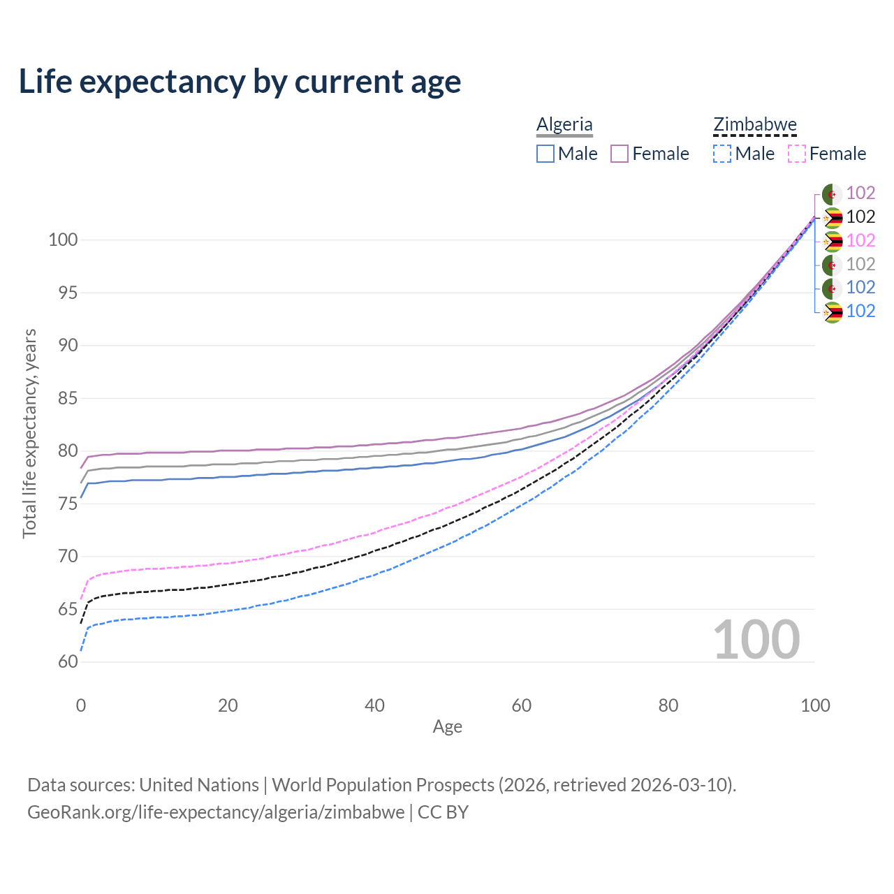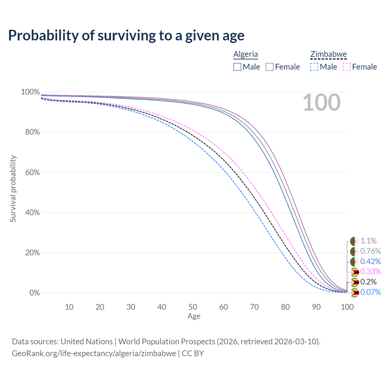 This life expectancy calculator shows the odds of living to 100, 95, 90, and below based on current age for both males and females in Algeria and Zimbabwe, along with mean and median age of death. The calculations are based on the 2026 life tables (actuarial tables) from the UN World Population Prospects.