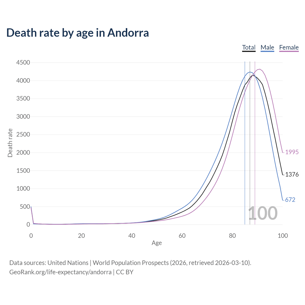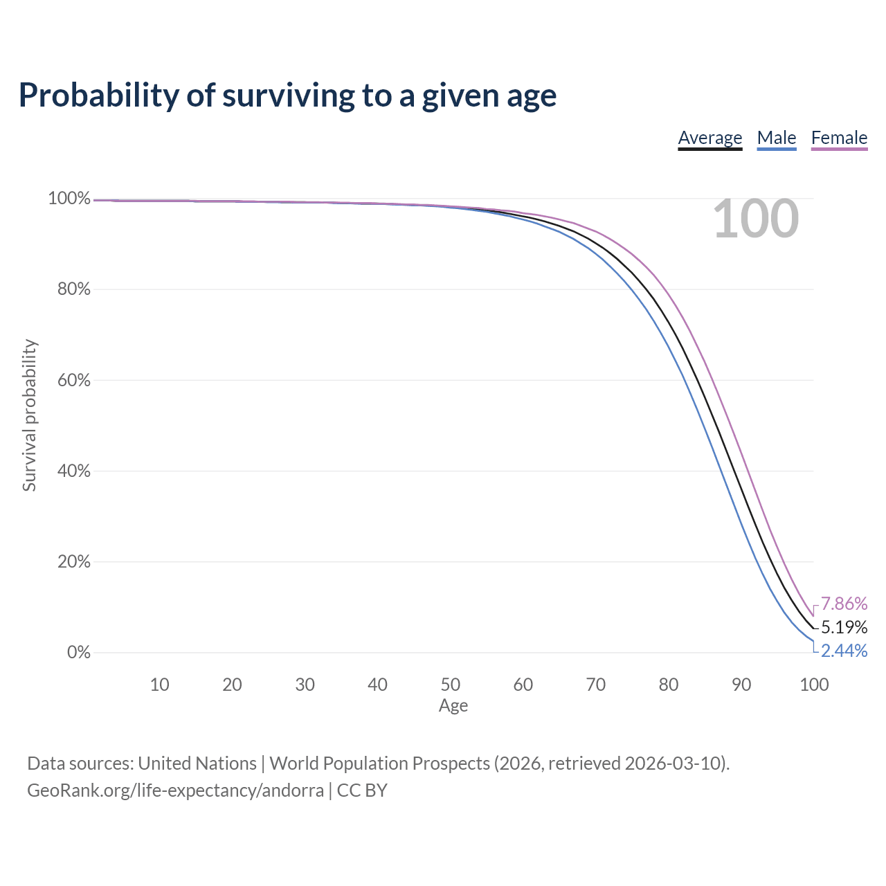 This life expectancy calculator shows the odds of living to 100, 95, 90, and below based on current age for both males and females in Andorra, along with mean and median age of death. The calculations are based on the 2026 life tables (actuarial tables) from the UN World Population Prospects.
