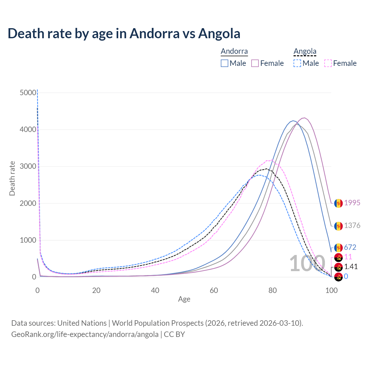 In Andorra, the most common age of death is 88, compared to 0 in Angola. The median age of death is 86.6 in Andorra and 71.9 in Angola, meaning only half of each cohort is expected to live past that age.