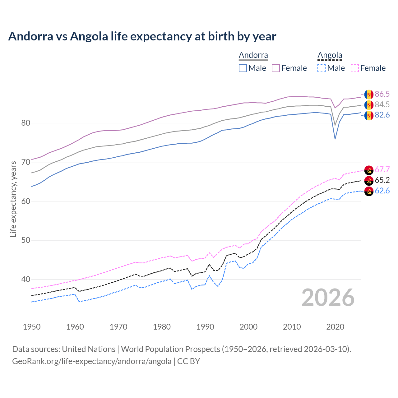 The average life expectancy at birth is 84.5 years in Andorra vs 65.2 in Angola. Andorra is ranked 5/197 by life expectancy, and Angola is 171/197. In Andorra, the life expectancy is 82.6 years for males and 86.5 years for females. In Angola, it's 62.6 years for males and 67.7 years for females.
