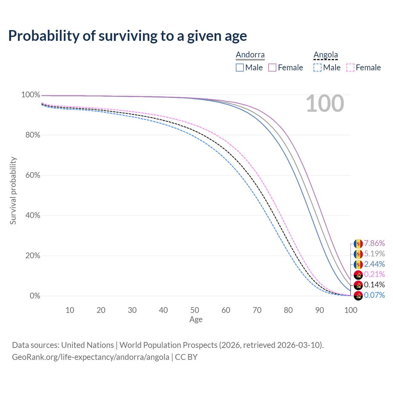 This life expectancy calculator shows the odds of living to 100, 95, 90, and below based on current age for both males and females in Andorra and Angola, along with mean and median age of death. The calculations are based on the 2026 life tables (actuarial tables) from the UN World Population Prospects.
