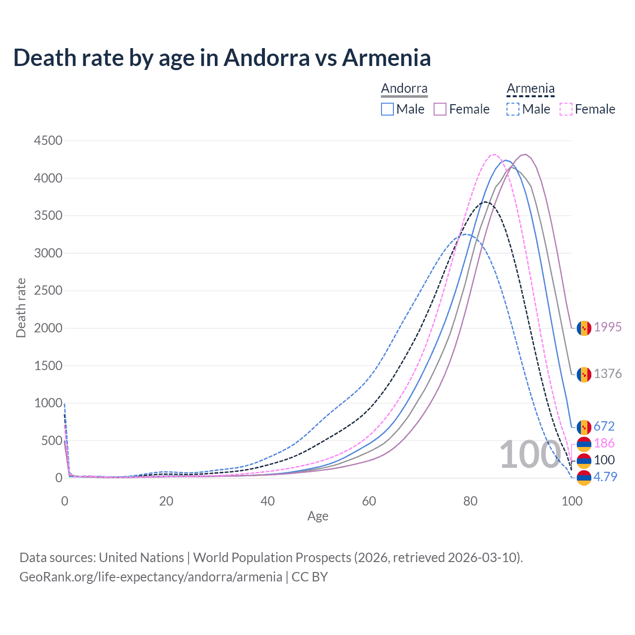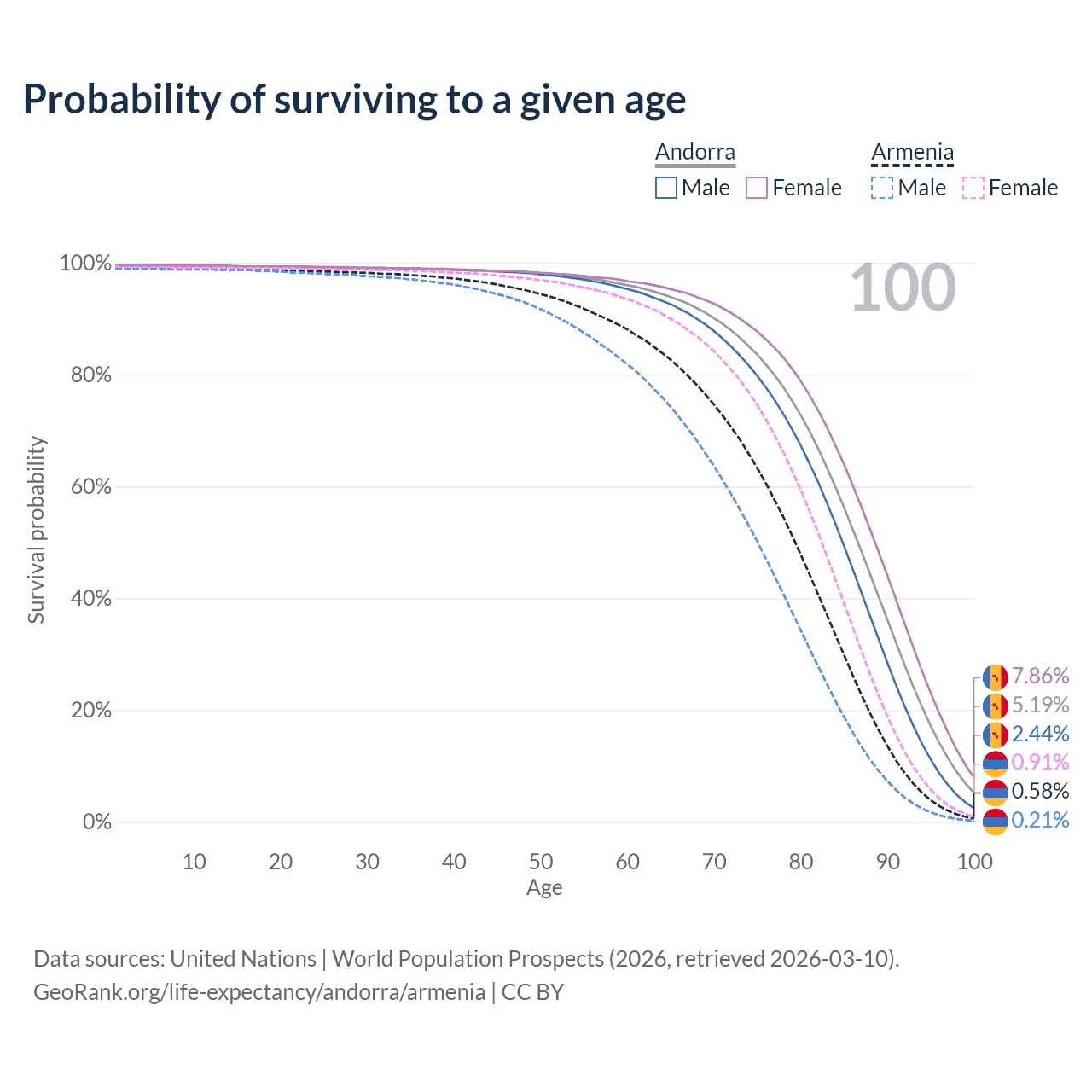 This life expectancy calculator shows the odds of living to 100, 95, 90, and below based on current age for both males and females in Andorra and Armenia, along with mean and median age of death. The calculations are based on the 2026 life tables (actuarial tables) from the UN World Population Prospects.