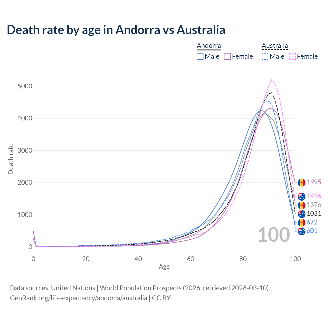 This life expectancy calculator shows the odds of living to 100, 95, 90, and below based on current age for both males and females in Andorra and Australia, along with mean and median age of death. The calculations are based on the 2026 life tables (actuarial tables) from the UN World Population Prospects.