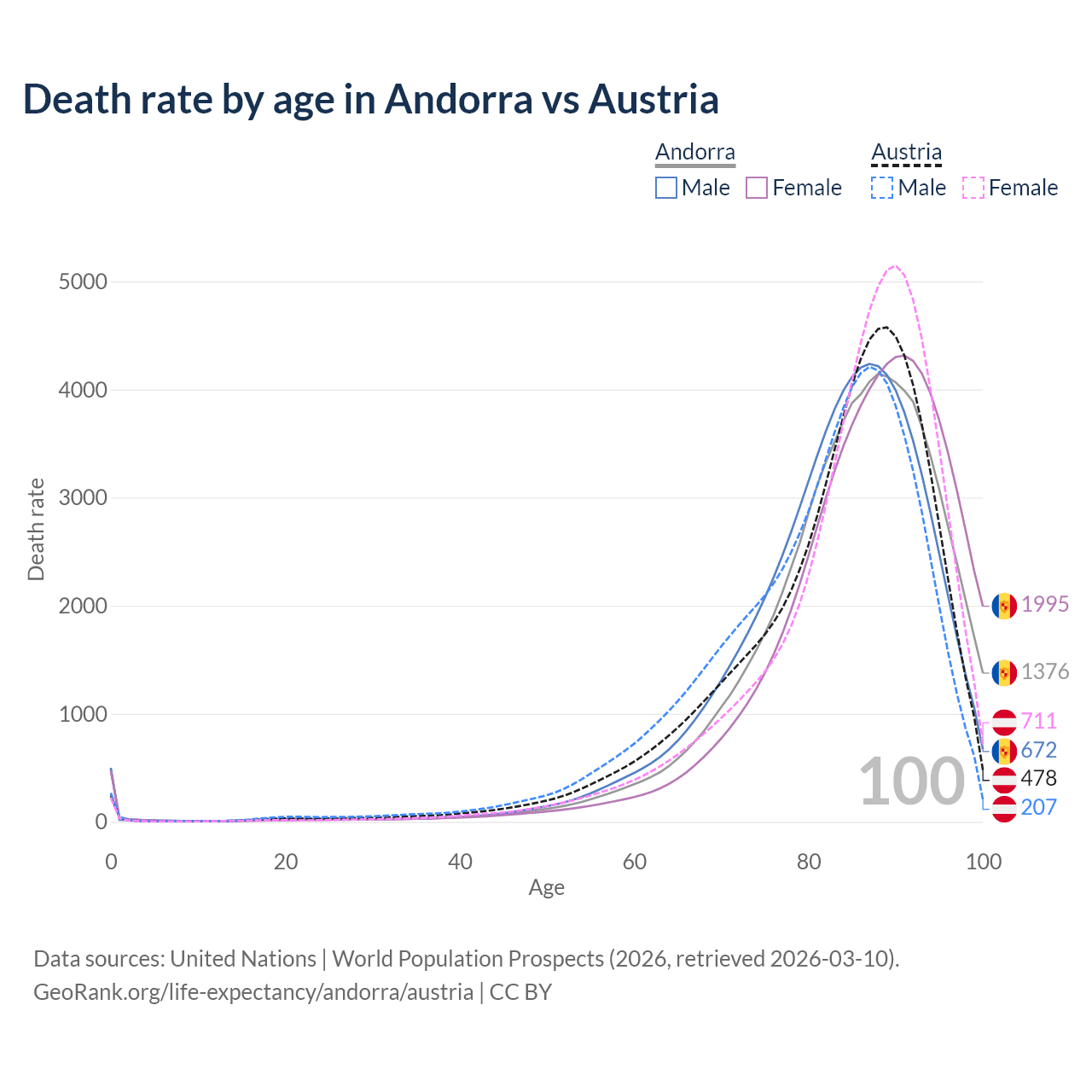 In Andorra, the most common age of death is 88, compared to 89 in Austria. The median age of death is 86.6 in Andorra and 85.6 in Austria, meaning only half of each cohort is expected to live past that age.