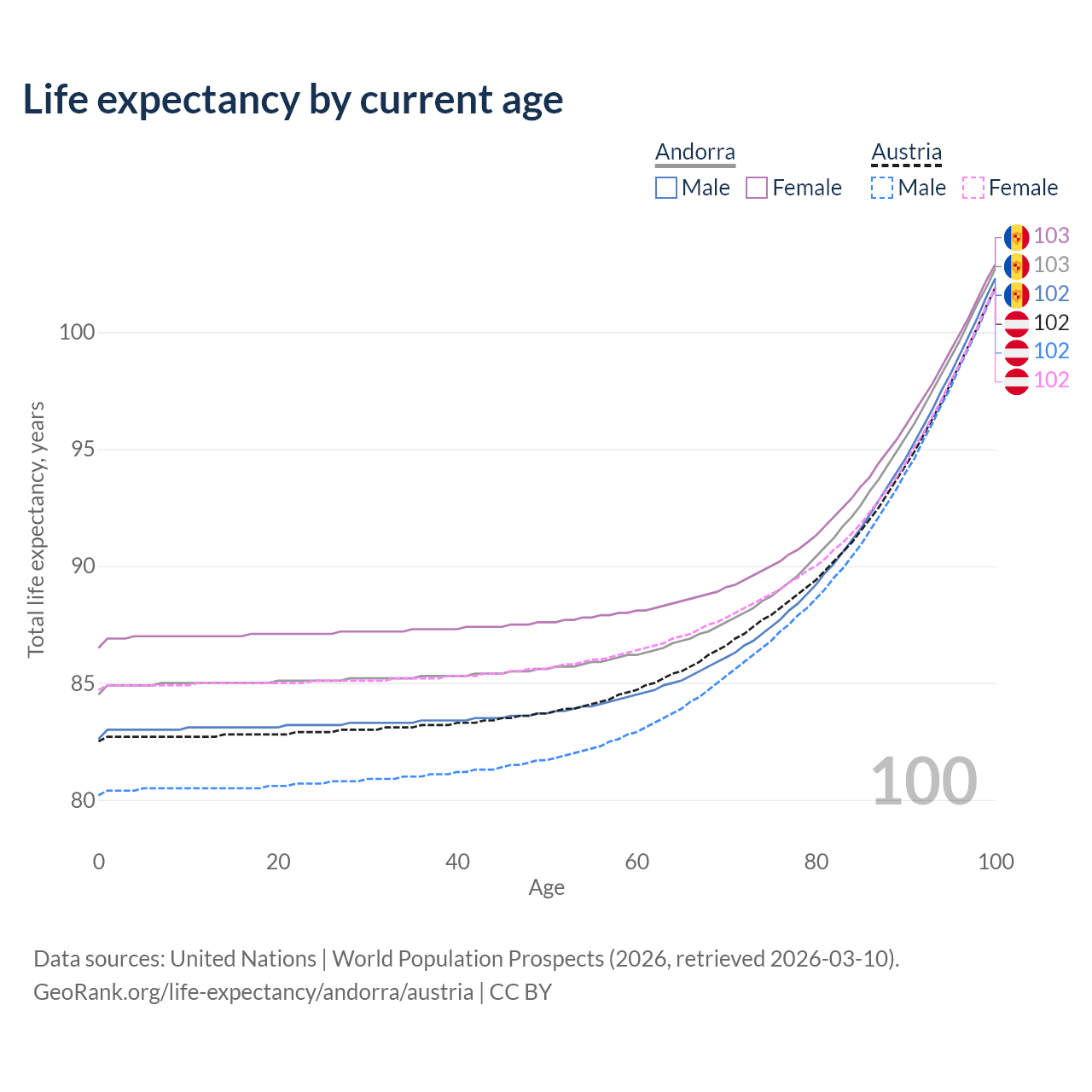 This life expectancy calculator shows the odds of living to 100, 95, 90, and below based on current age for both males and females in Andorra and Austria, along with mean and median age of death. The calculations are based on the 2026 life tables (actuarial tables) from the UN World Population Prospects.