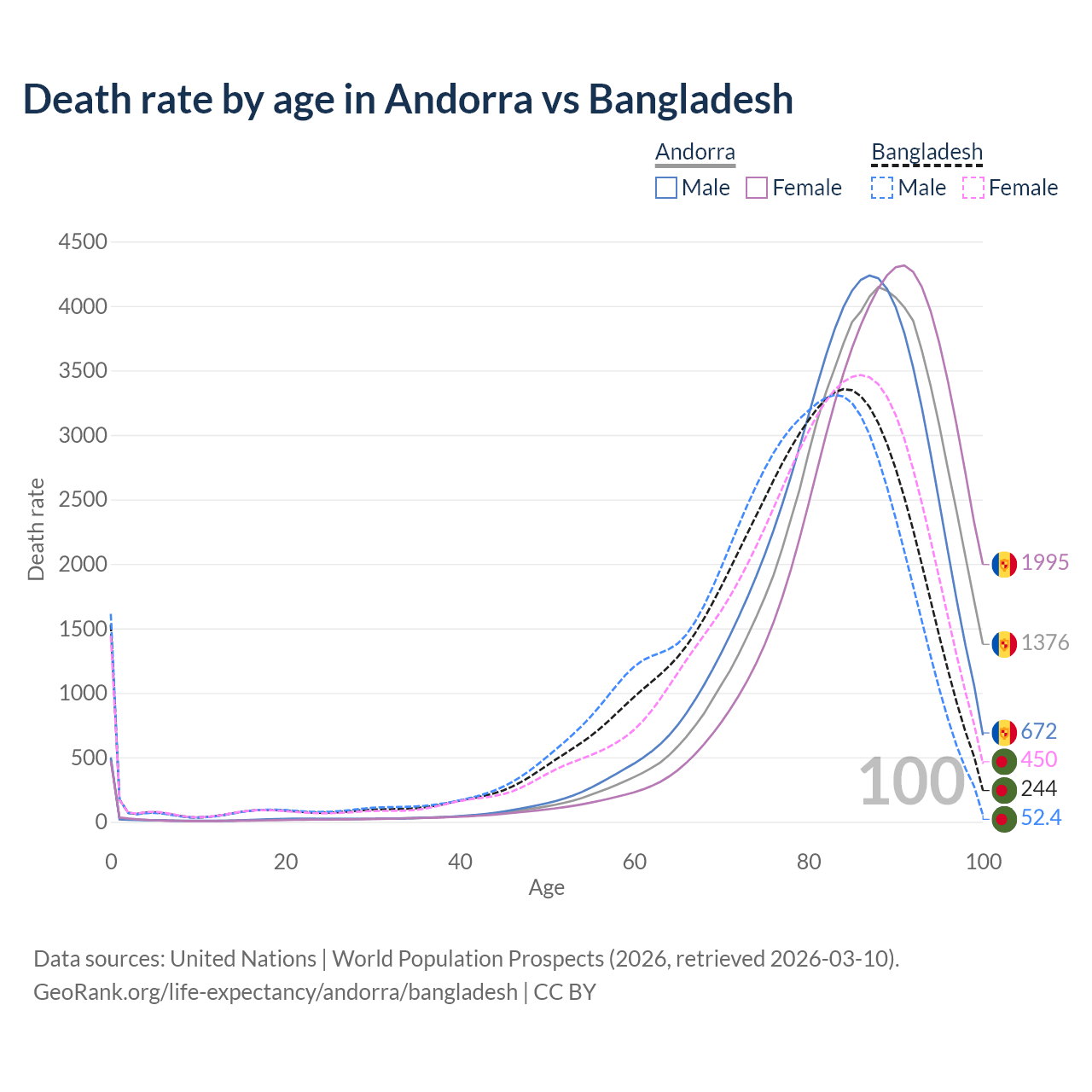 In Andorra, the most common age of death is 88, compared to 84 in Bangladesh. The median age of death is 86.6 in Andorra and 79.7 in Bangladesh, meaning only half of each cohort is expected to live past that age.