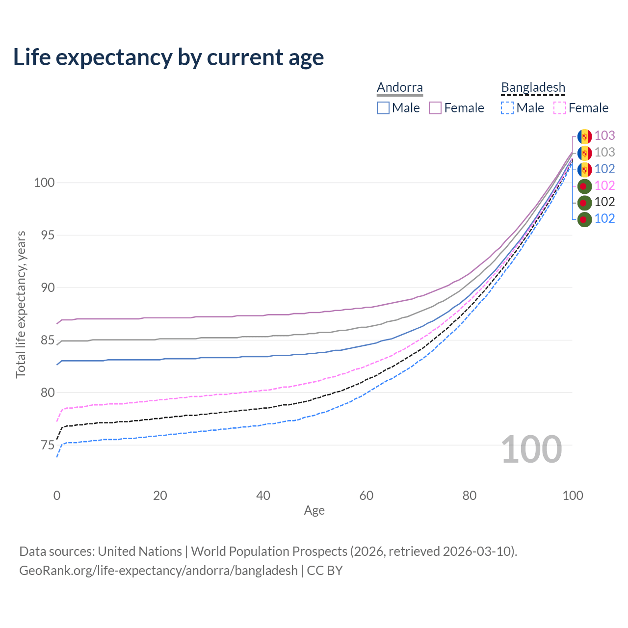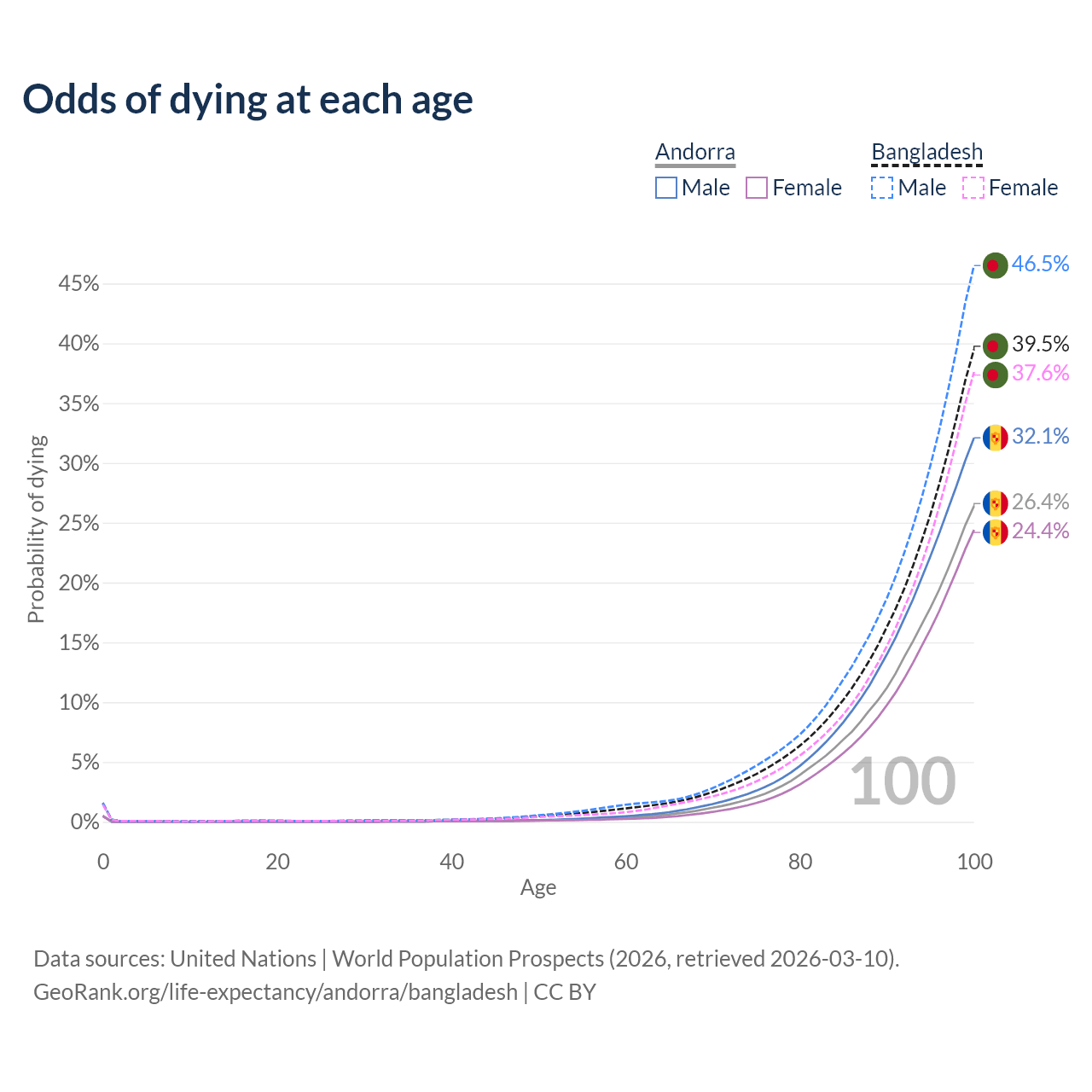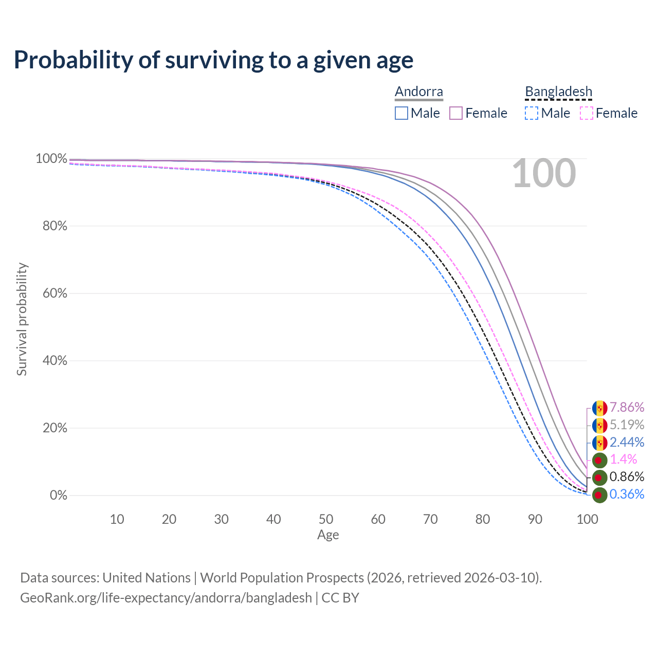 This life expectancy calculator shows the odds of living to 100, 95, 90, and below based on current age for both males and females in Andorra and Bangladesh, along with mean and median age of death. The calculations are based on the 2026 life tables (actuarial tables) from the UN World Population Prospects.