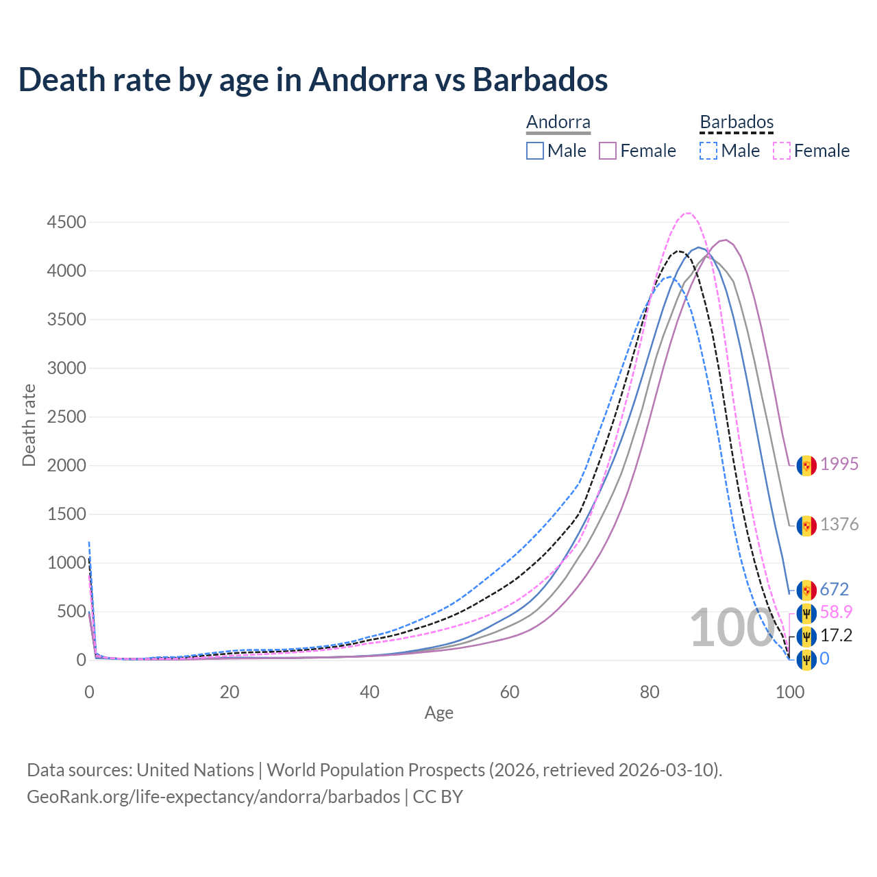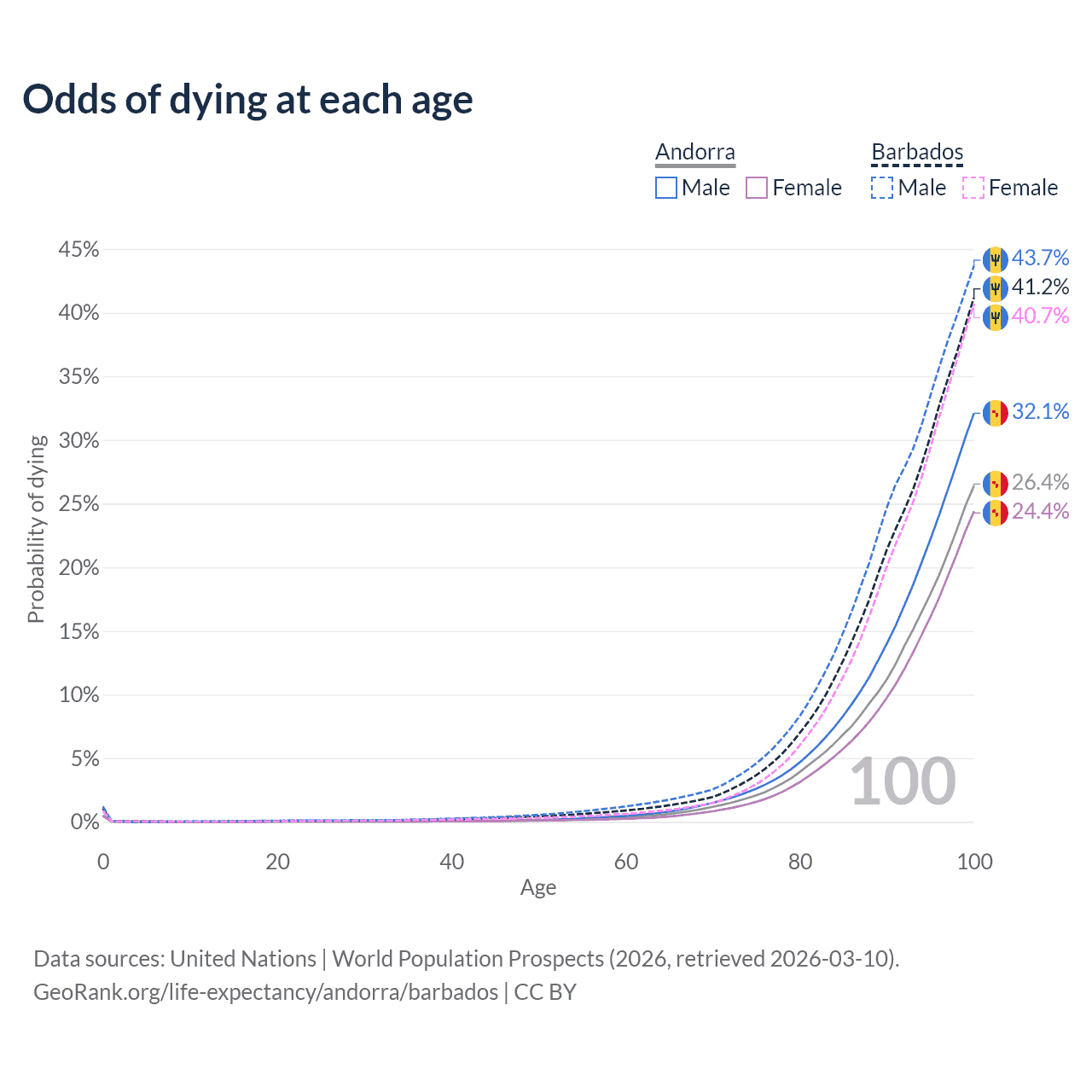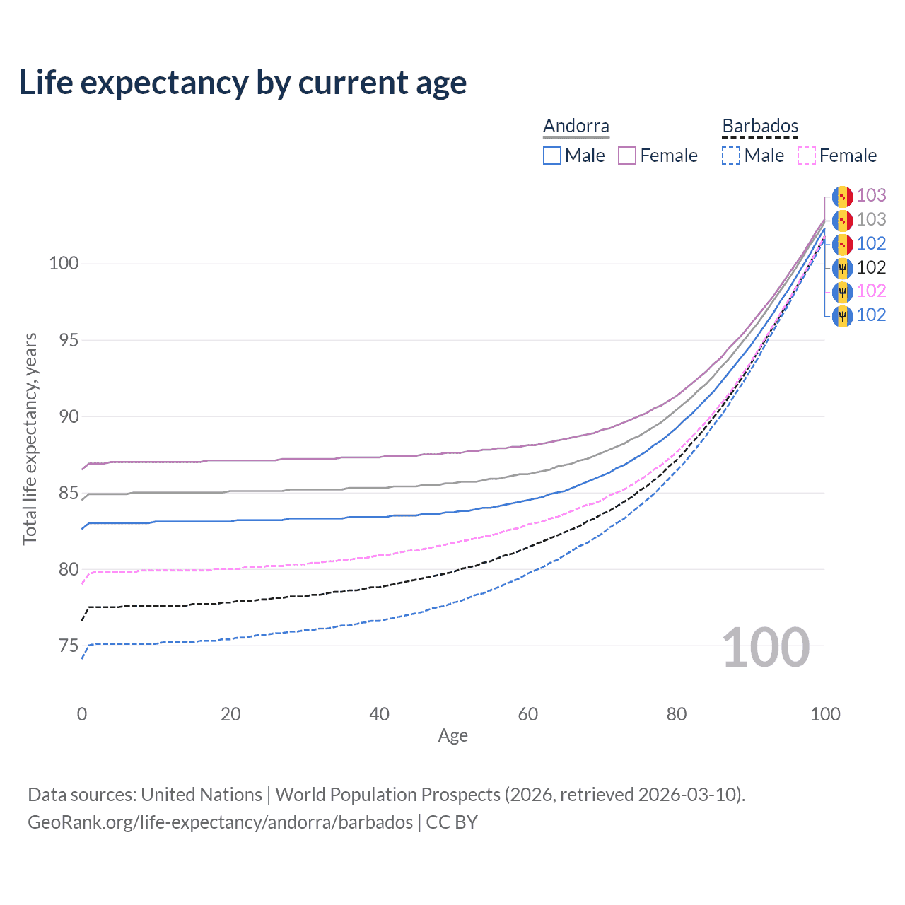 This life expectancy calculator shows the odds of living to 100, 95, 90, and below based on current age for both males and females in Andorra and Barbados, along with mean and median age of death. The calculations are based on the 2026 life tables (actuarial tables) from the UN World Population Prospects.