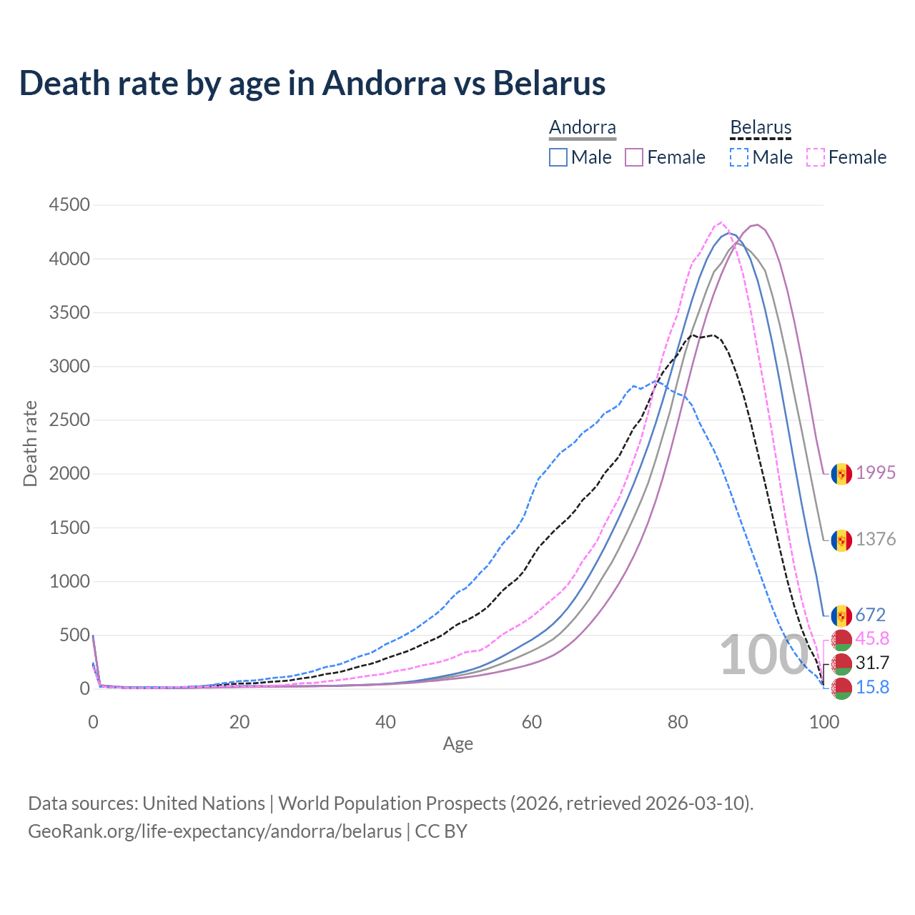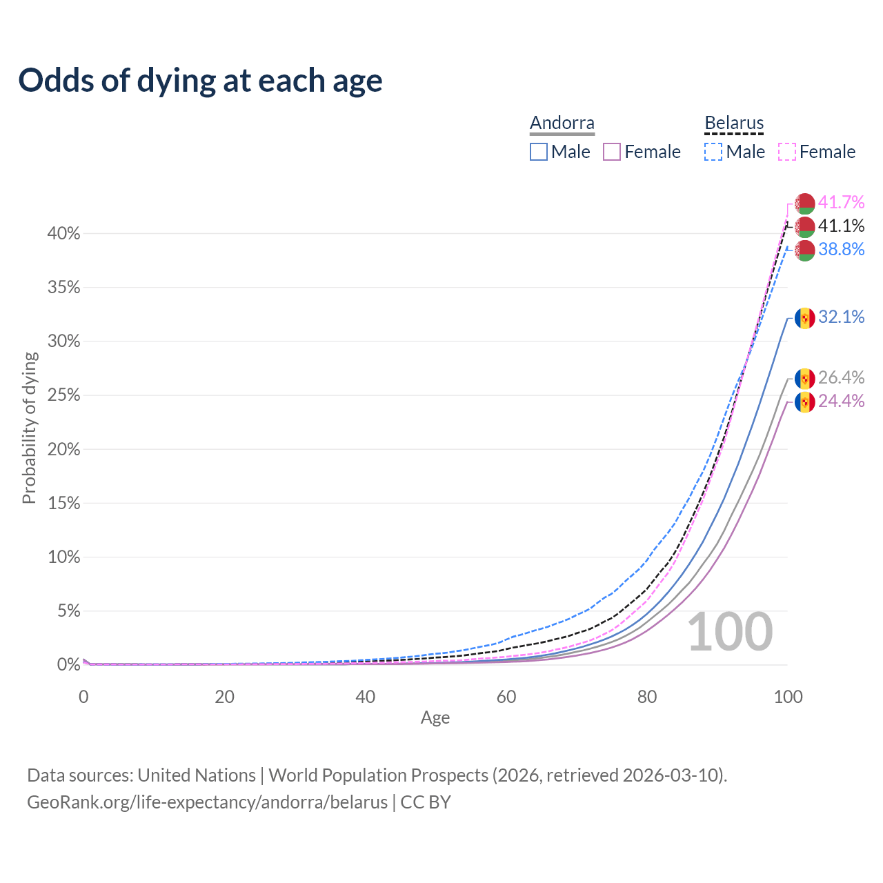 This life expectancy calculator shows the odds of living to 100, 95, 90, and below based on current age for both males and females in Andorra and Belarus, along with mean and median age of death. The calculations are based on the 2026 life tables (actuarial tables) from the UN World Population Prospects.