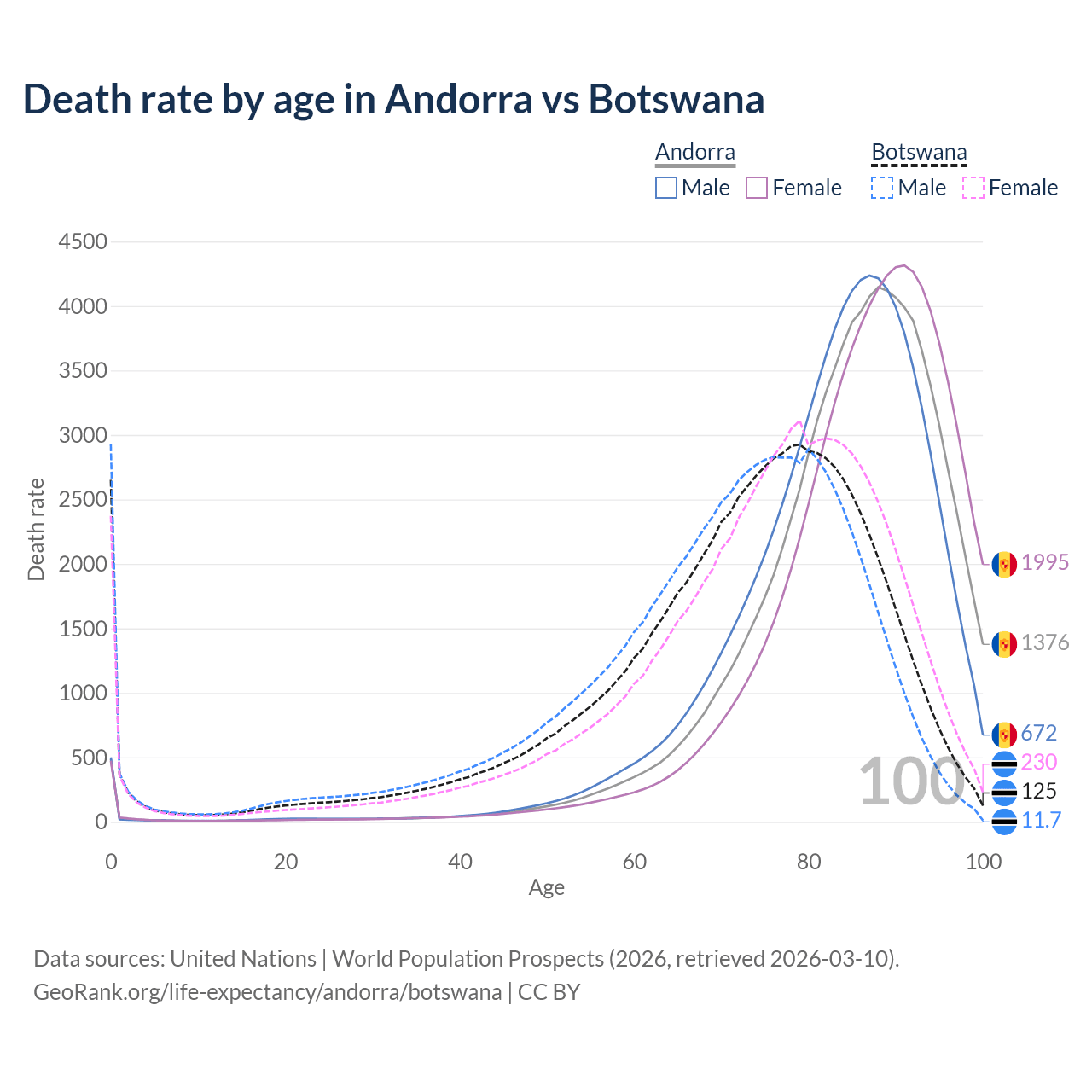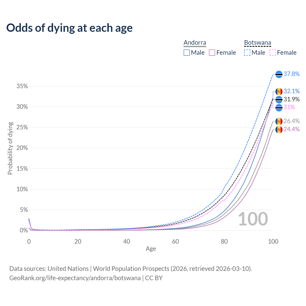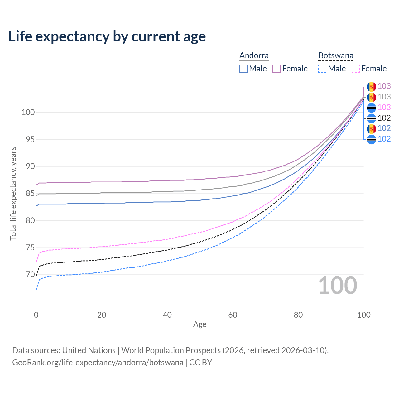 This life expectancy calculator shows the odds of living to 100, 95, 90, and below based on current age for both males and females in Andorra and Botswana, along with mean and median age of death. The calculations are based on the 2026 life tables (actuarial tables) from the UN World Population Prospects.