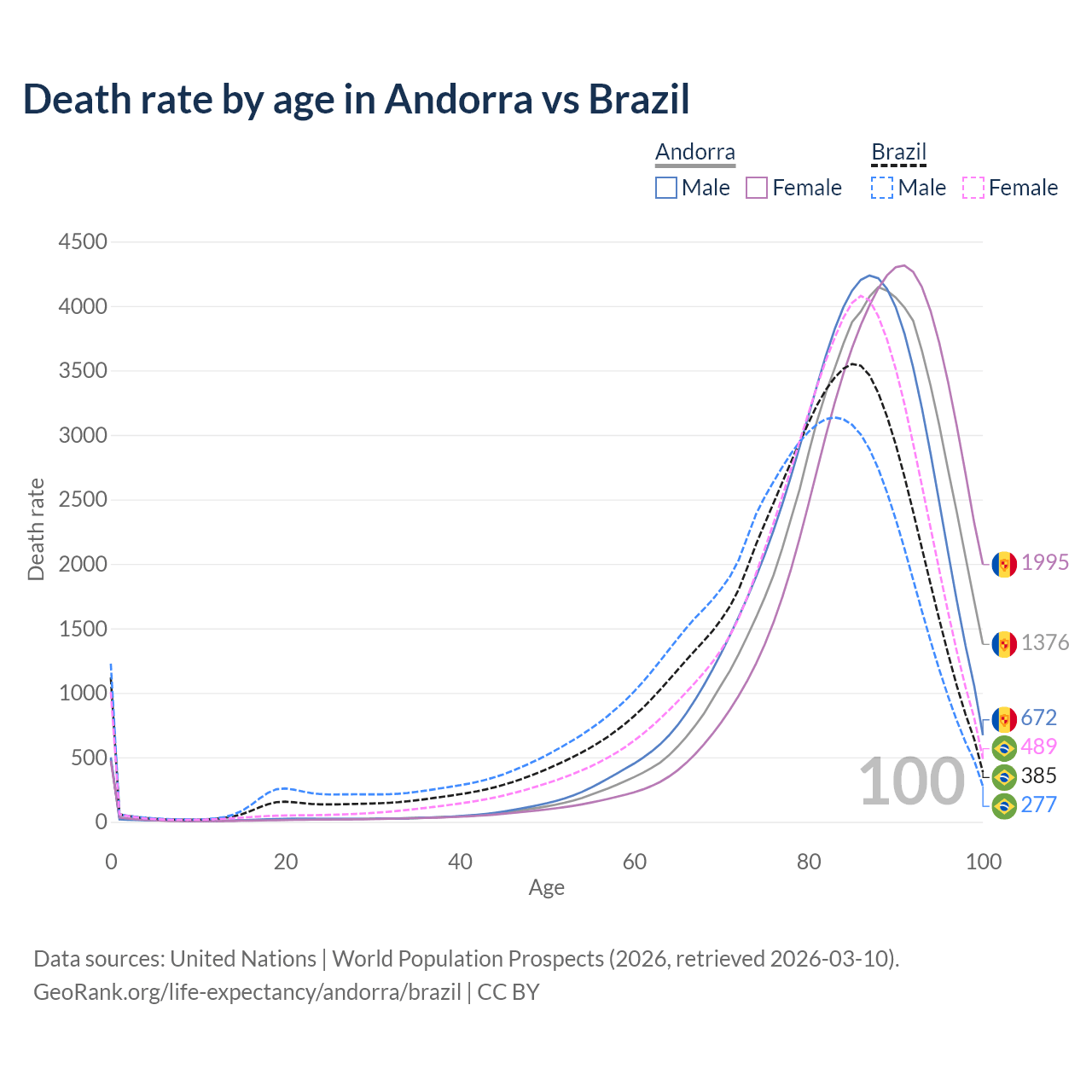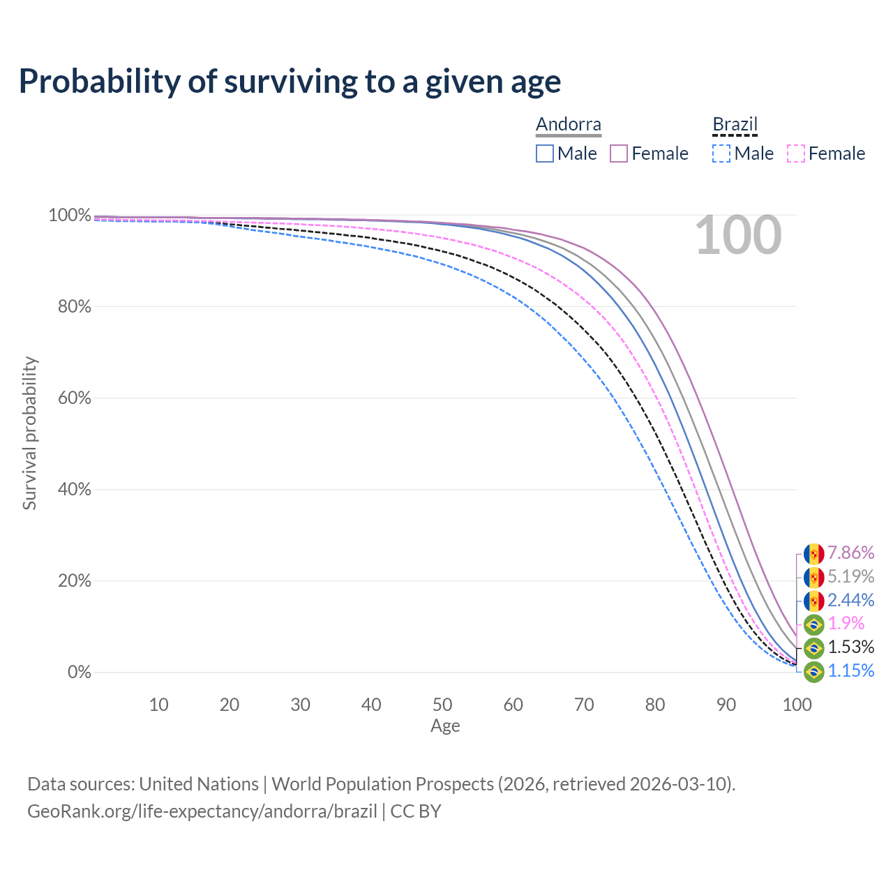 This life expectancy calculator shows the odds of living to 100, 95, 90, and below based on current age for both males and females in Andorra and Brazil, along with mean and median age of death. The calculations are based on the 2026 life tables (actuarial tables) from the UN World Population Prospects.