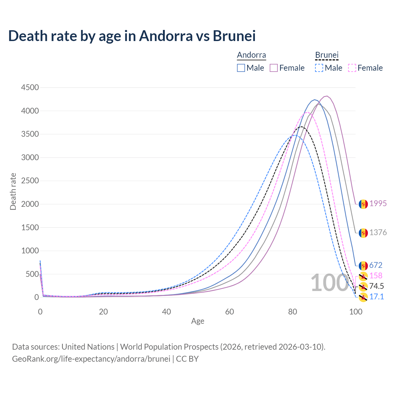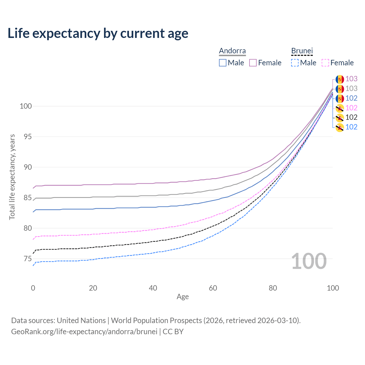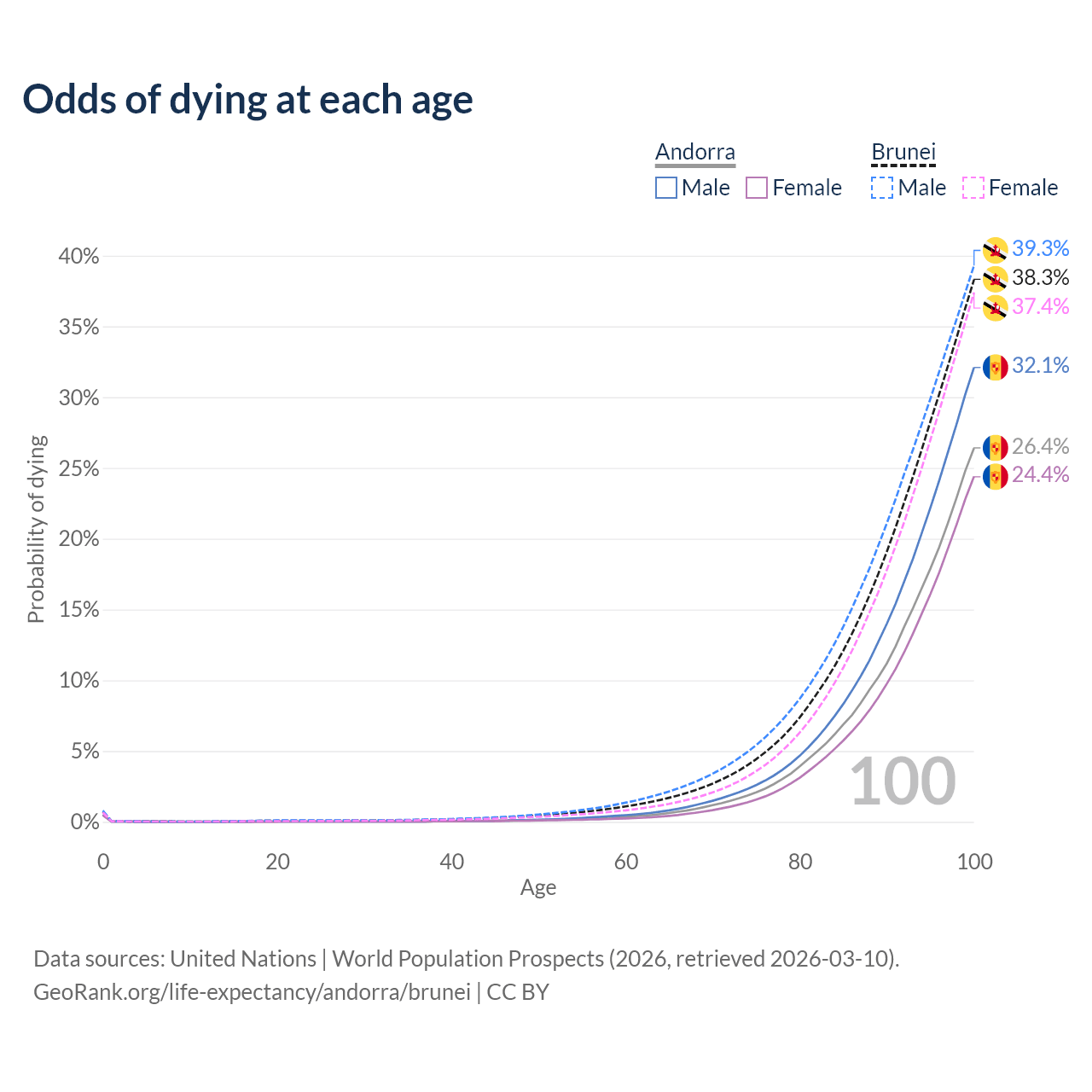 This life expectancy calculator shows the odds of living to 100, 95, 90, and below based on current age for both males and females in Andorra and Brunei, along with mean and median age of death. The calculations are based on the 2026 life tables (actuarial tables) from the UN World Population Prospects.