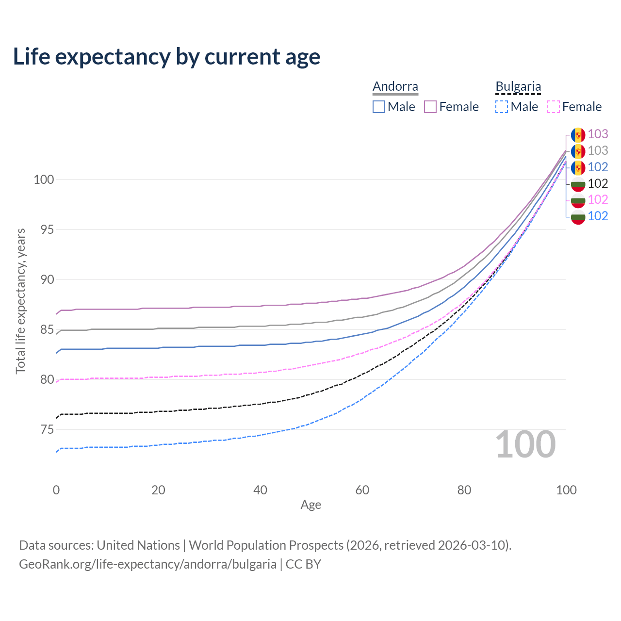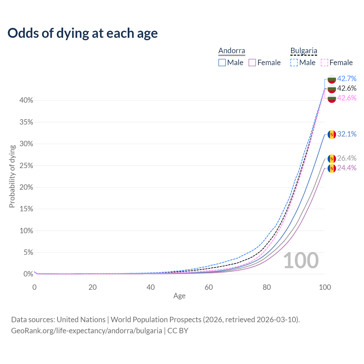 This life expectancy calculator shows the odds of living to 100, 95, 90, and below based on current age for both males and females in Andorra and Bulgaria, along with mean and median age of death. The calculations are based on the 2026 life tables (actuarial tables) from the UN World Population Prospects.