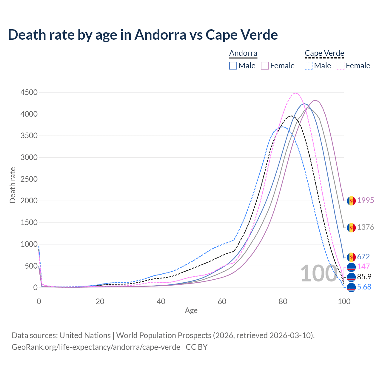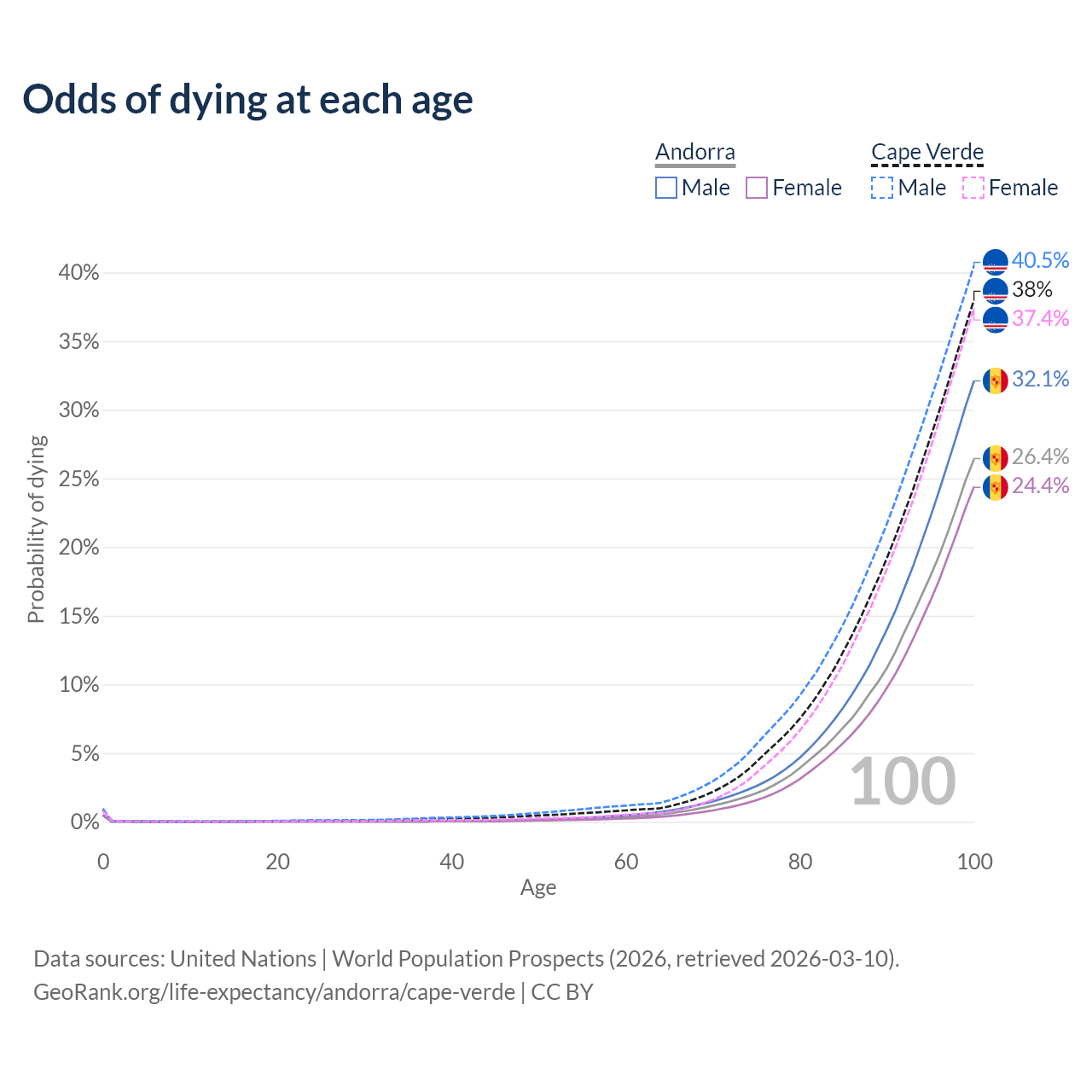 This life expectancy calculator shows the odds of living to 100, 95, 90, and below based on current age for both males and females in Andorra and Cape Verde, along with mean and median age of death. The calculations are based on the 2026 life tables (actuarial tables) from the UN World Population Prospects.