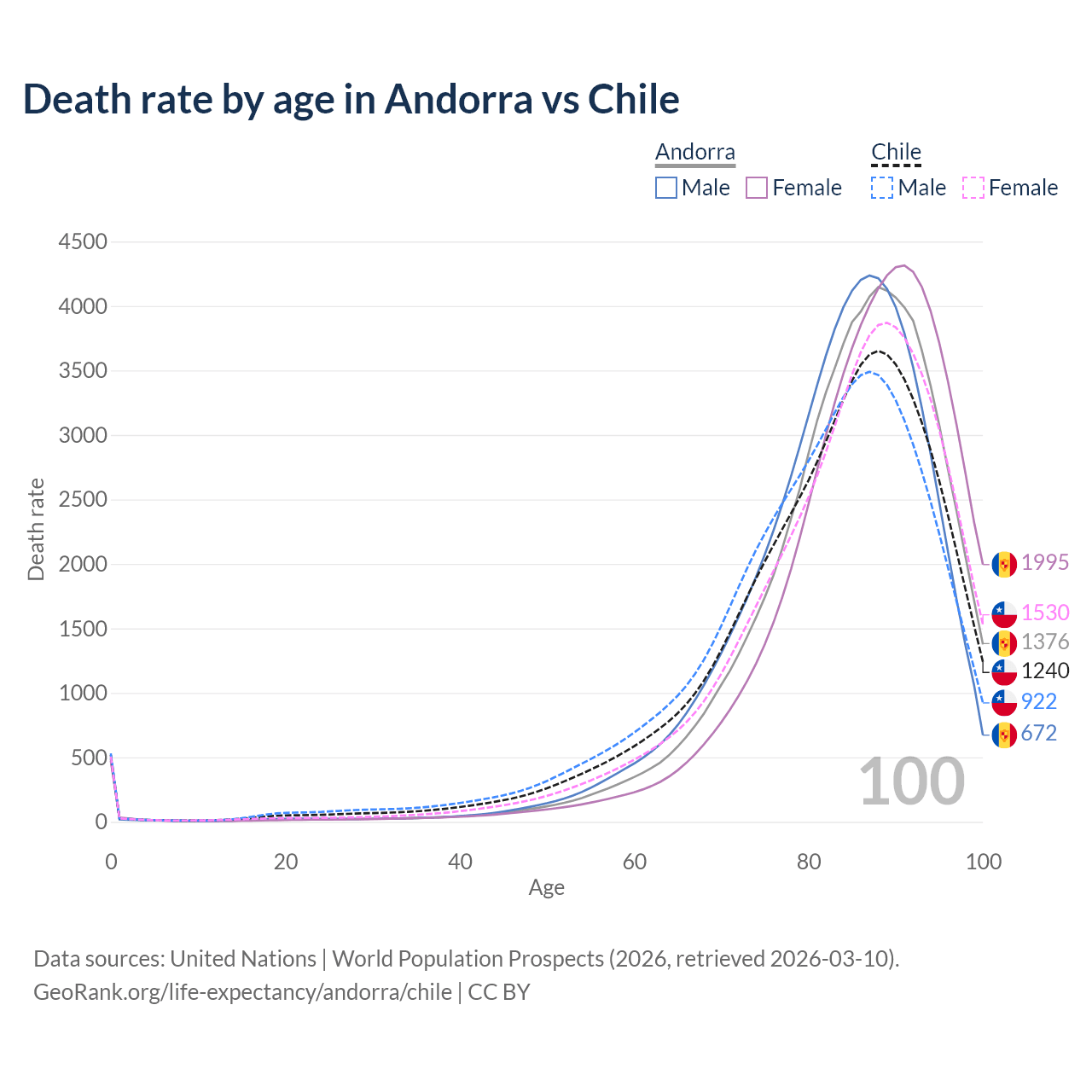 In Andorra, the most common age of death is 88, compared to 88 in Chile. The median age of death is 86.6 in Andorra and 84.8 in Chile, meaning only half of each cohort is expected to live past that age.