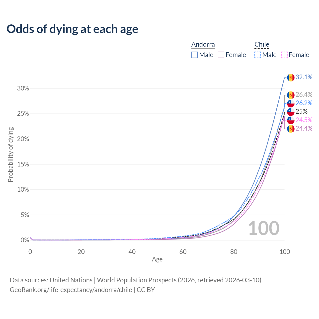 This life expectancy calculator shows the odds of living to 100, 95, 90, and below based on current age for both males and females in Andorra and Chile, along with mean and median age of death. The calculations are based on the 2026 life tables (actuarial tables) from the UN World Population Prospects.