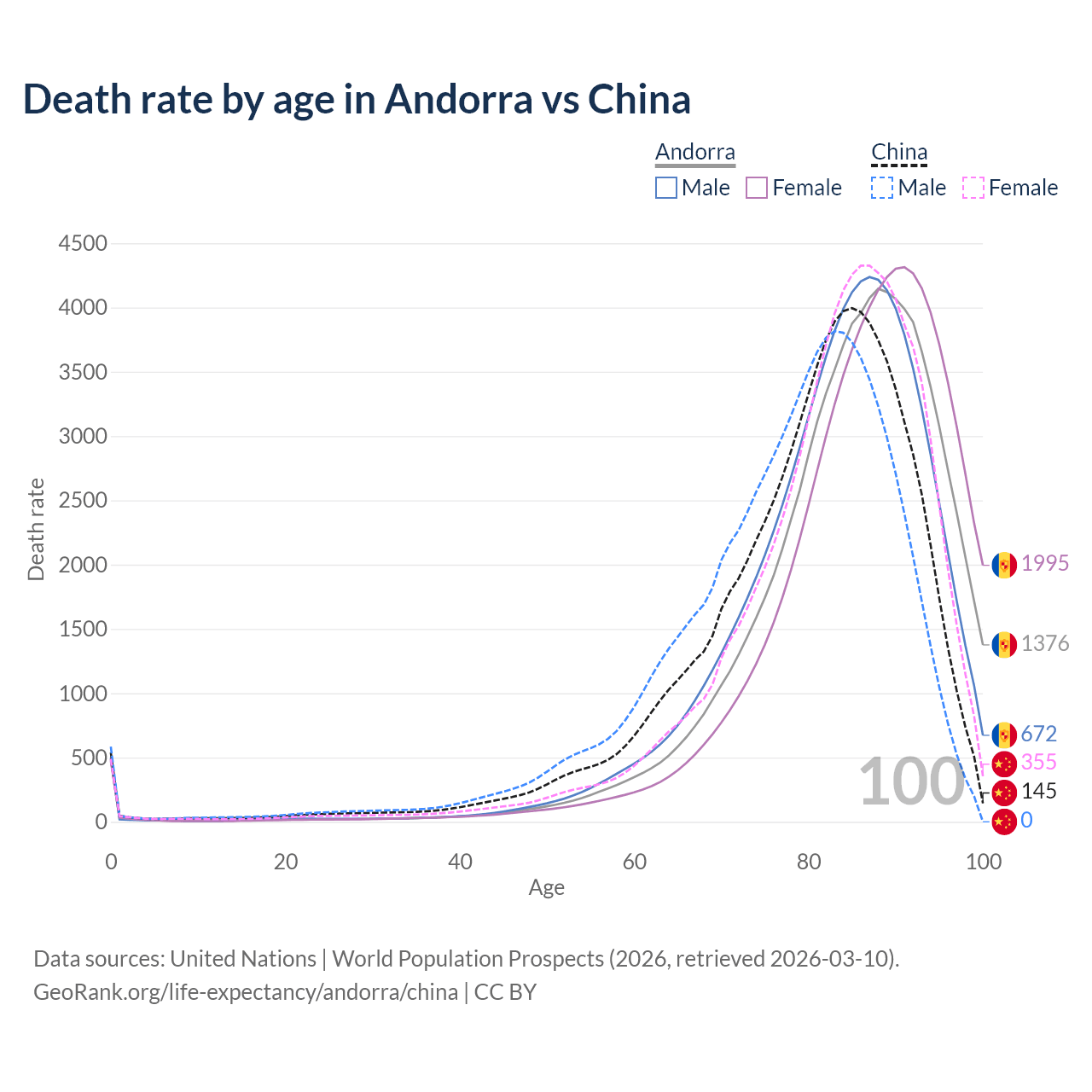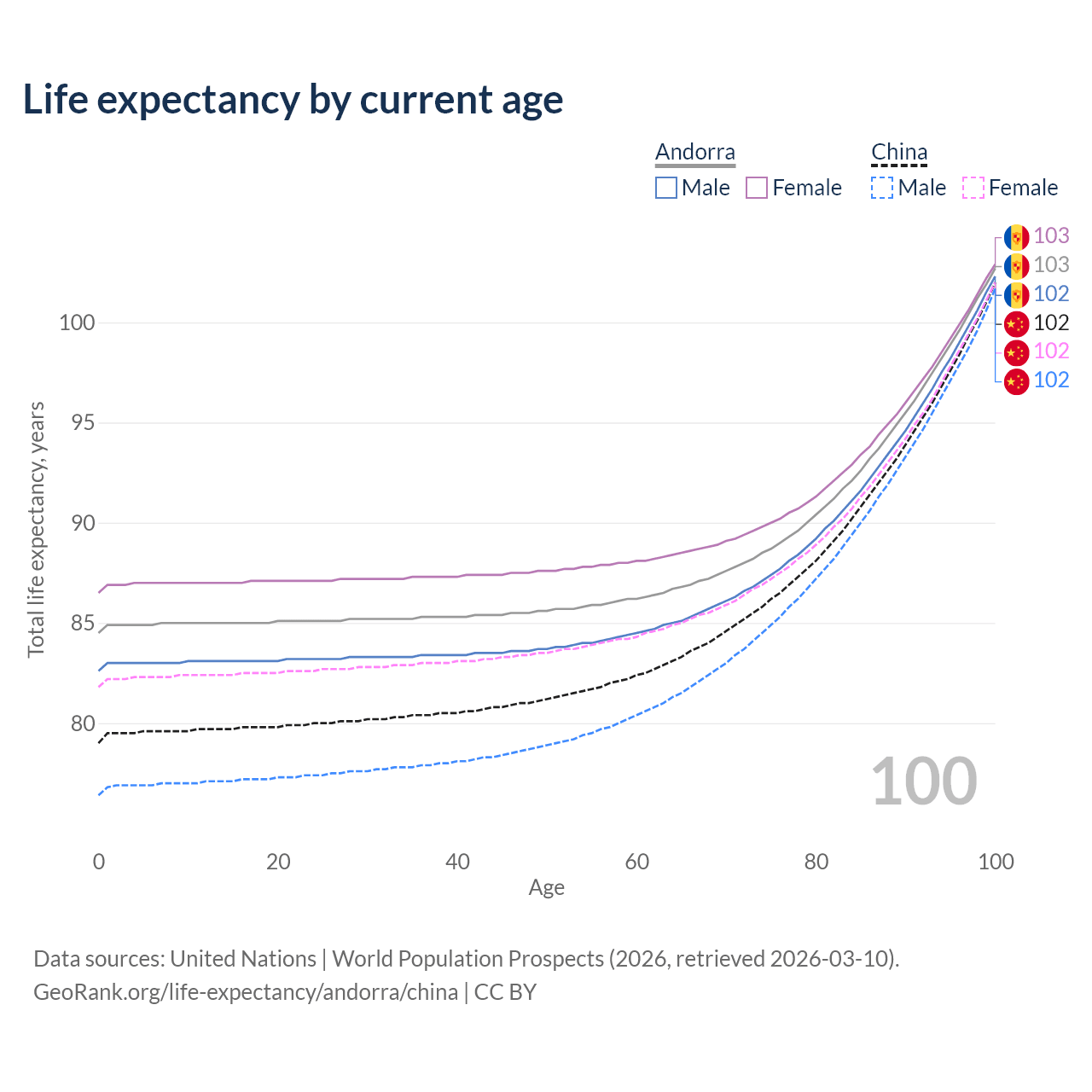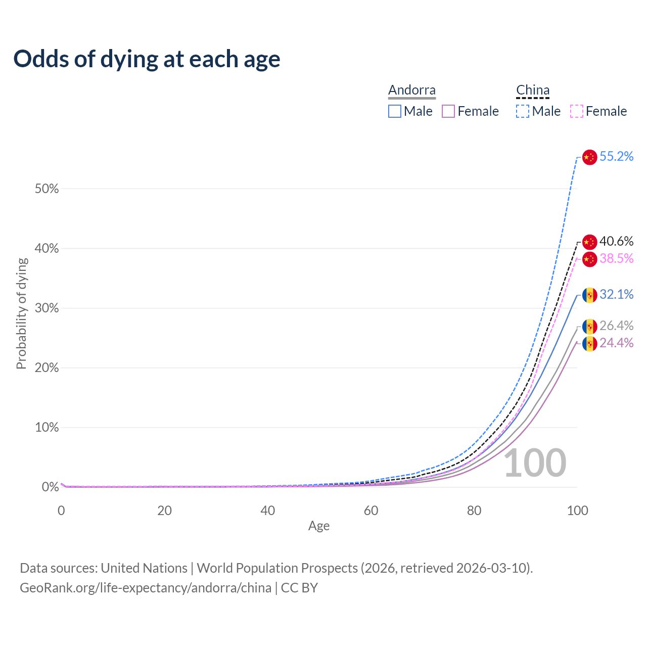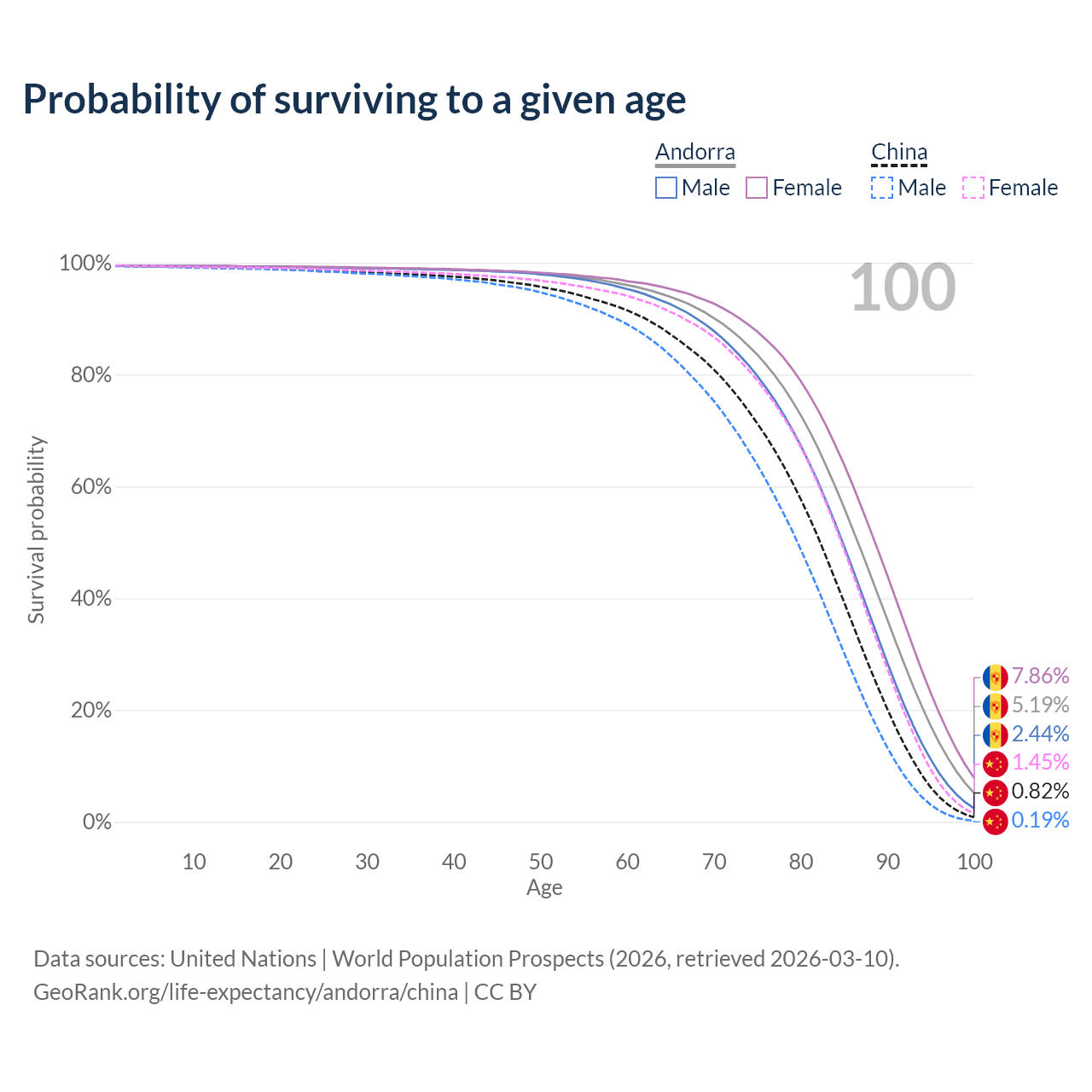 This life expectancy calculator shows the odds of living to 100, 95, 90, and below based on current age for both males and females in Andorra and China, along with mean and median age of death. The calculations are based on the 2026 life tables (actuarial tables) from the UN World Population Prospects.
