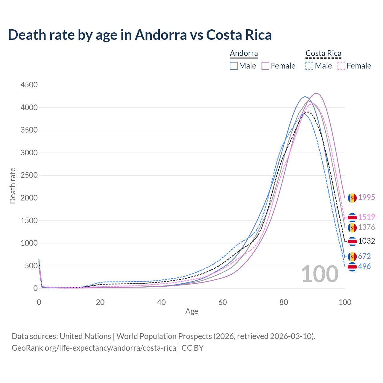 In Andorra, the most common age of death is 88, compared to 88 in Costa Rica. The median age of death is 86.6 in Andorra and 85 in Costa Rica, meaning only half of each cohort is expected to live past that age.