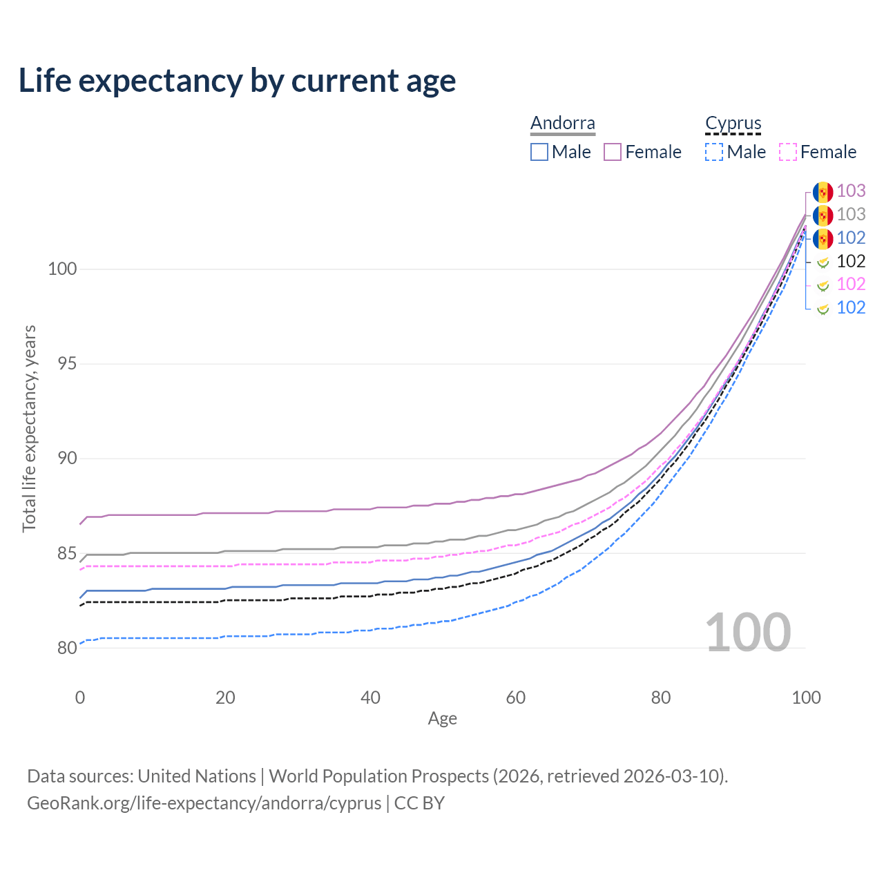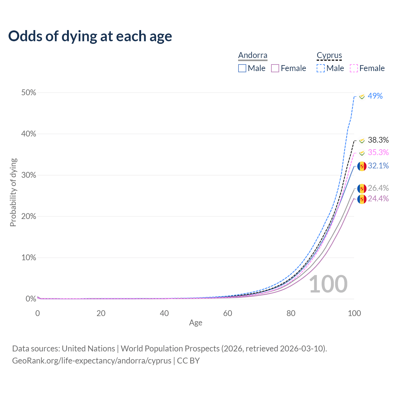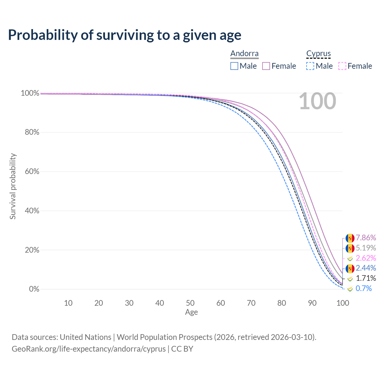 This life expectancy calculator shows the odds of living to 100, 95, 90, and below based on current age for both males and females in Andorra and Cyprus, along with mean and median age of death. The calculations are based on the 2026 life tables (actuarial tables) from the UN World Population Prospects.