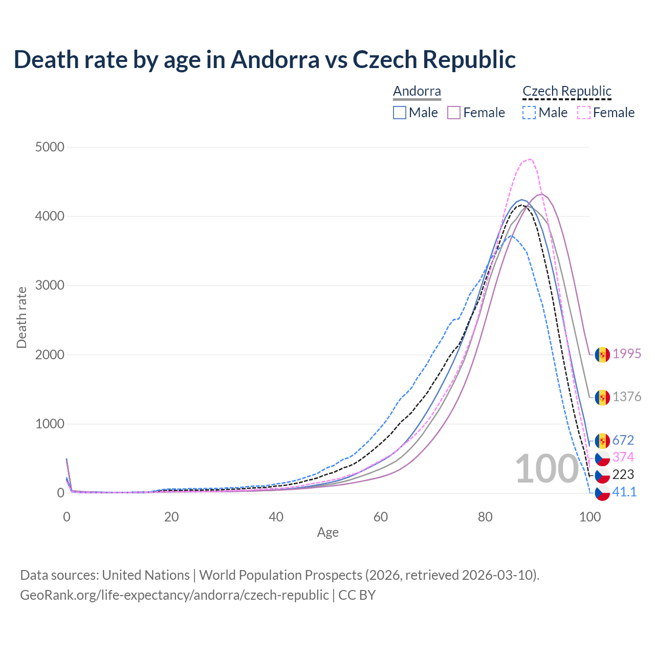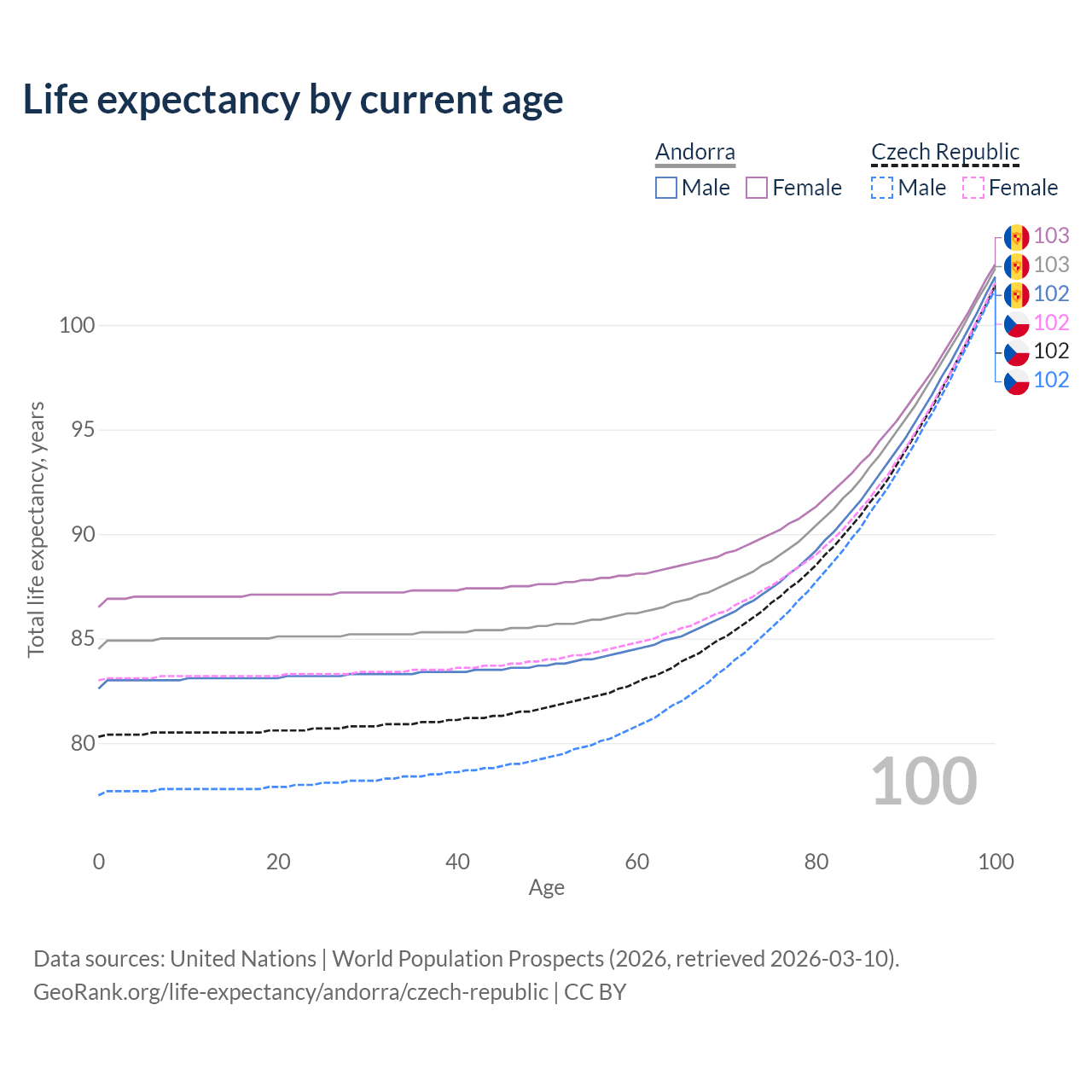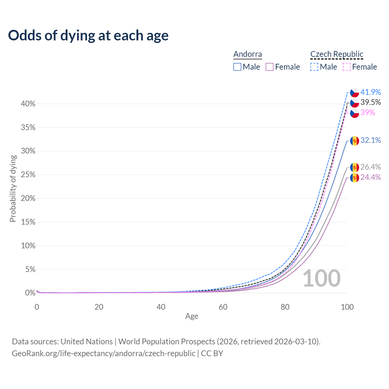 This life expectancy calculator shows the odds of living to 100, 95, 90, and below based on current age for both males and females in Andorra and the Czech Republic, along with mean and median age of death. The calculations are based on the 2026 life tables (actuarial tables) from the UN World Population Prospects.