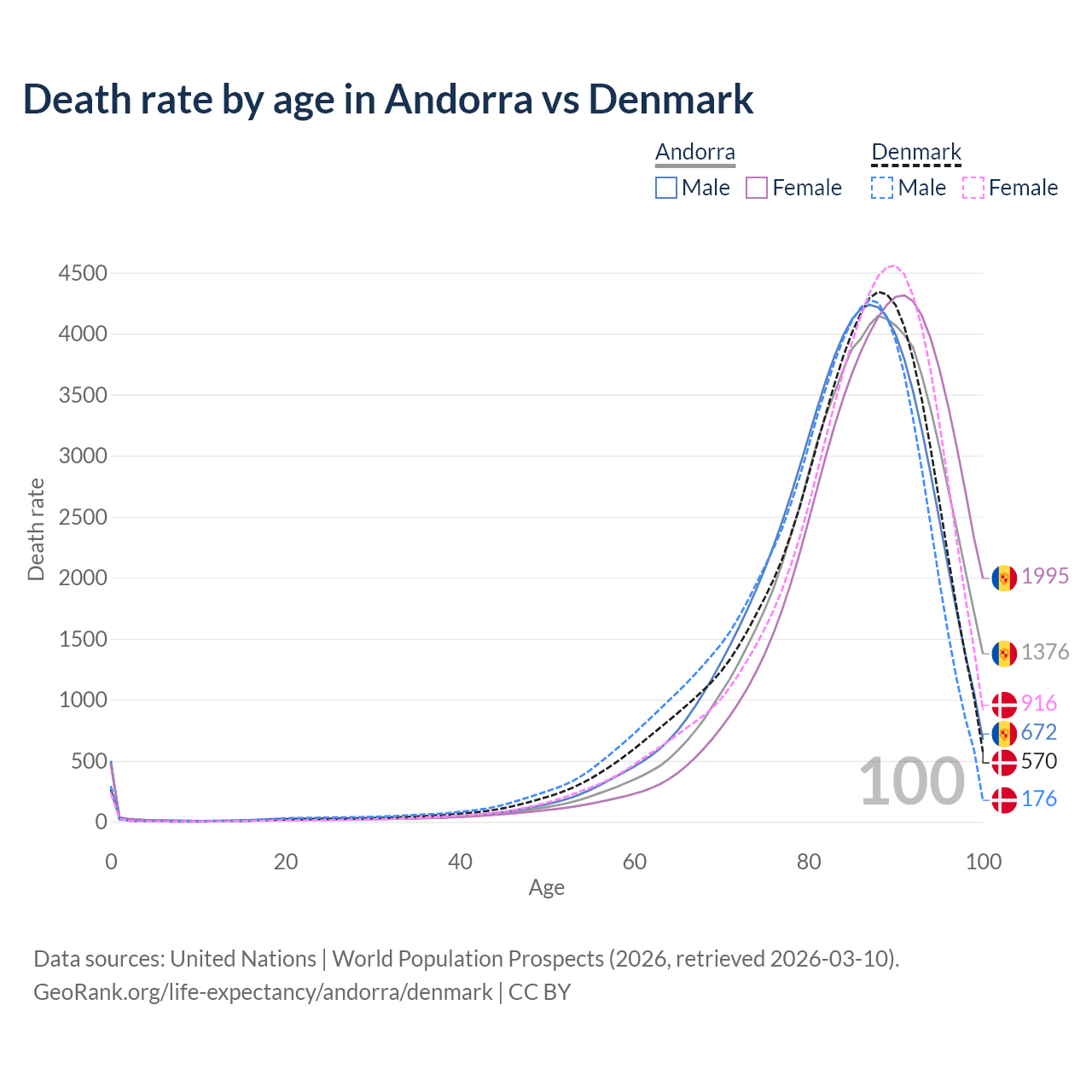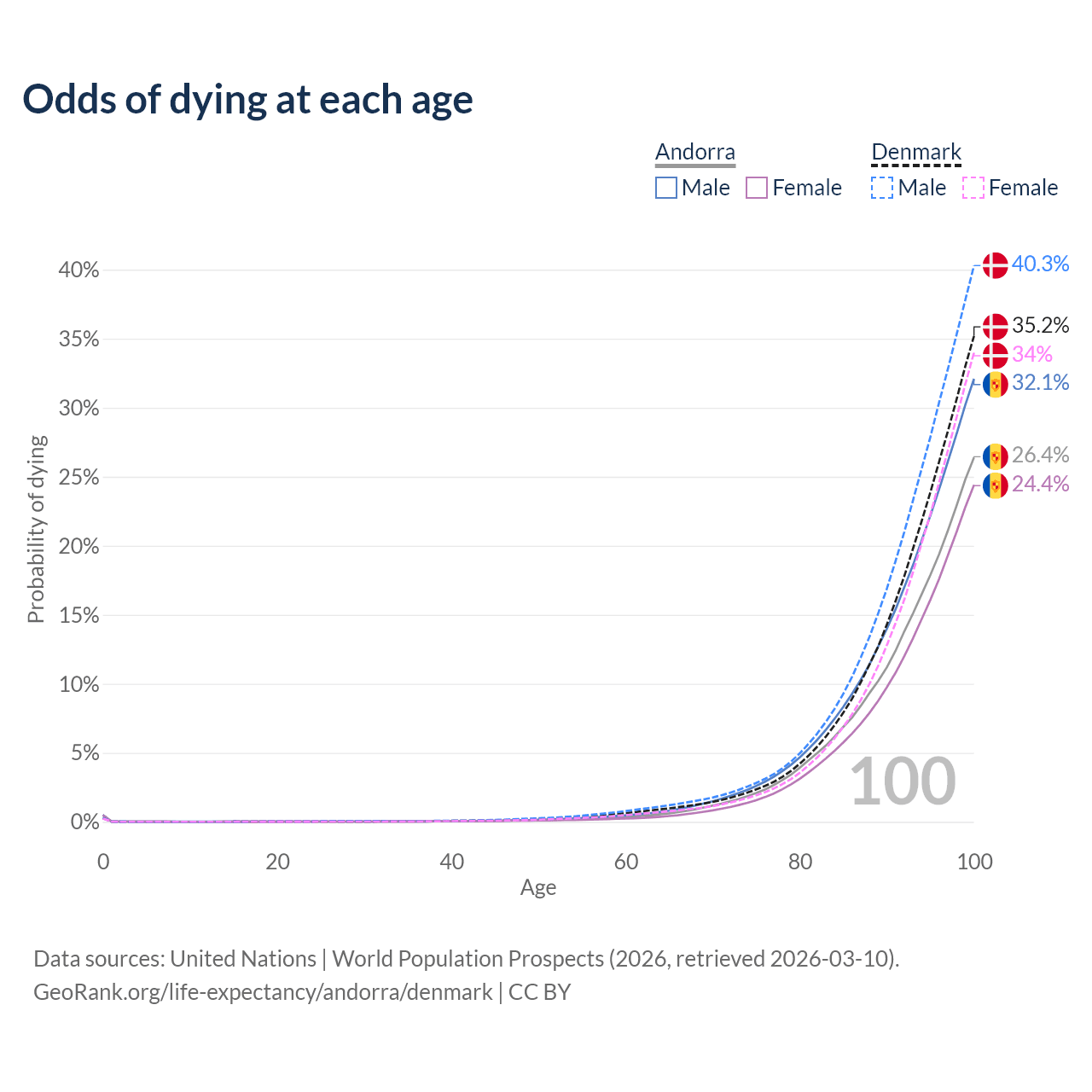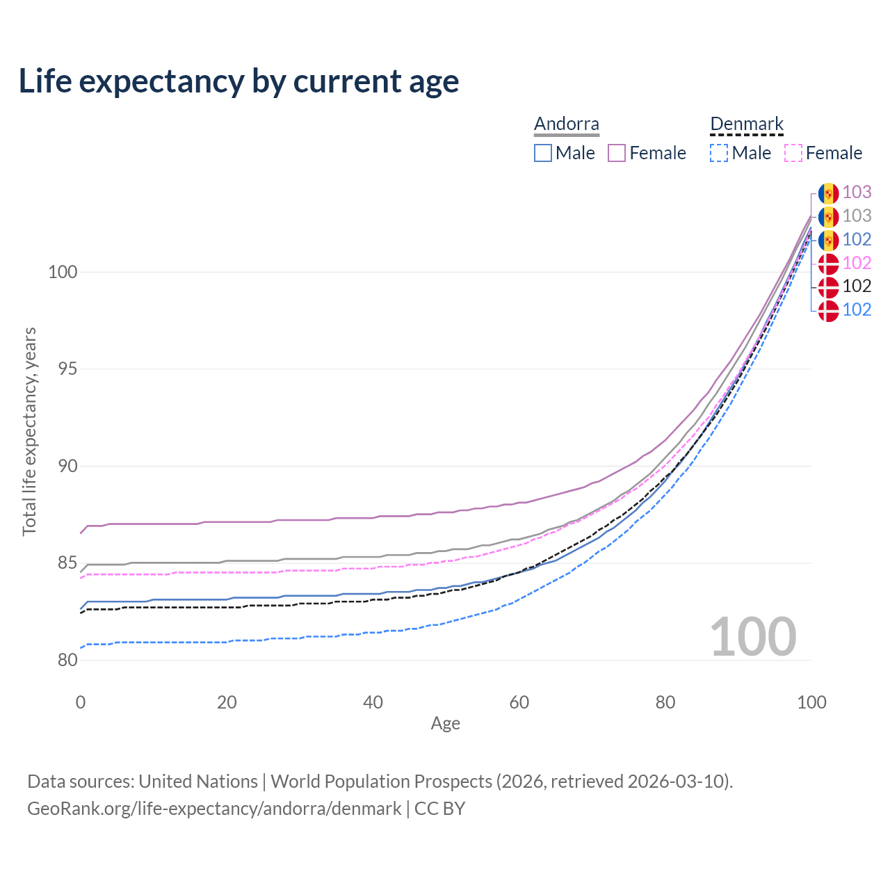 This life expectancy calculator shows the odds of living to 100, 95, 90, and below based on current age for both males and females in Andorra and Denmark, along with mean and median age of death. The calculations are based on the 2026 life tables (actuarial tables) from the UN World Population Prospects.